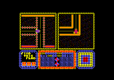Hop into the driving seat of a chunky little car and prepare to race around a huge arena of roadways seeking flags. You compete against a computer opponent who also wants those very same flags. The screen is split into three areas two overhead views of the cars and a status panel. The status panel is split into three smaller areas: two panels that show how many flags you've collected (one for you and one for the computer) and a small scale map of the arena. On the map are three dots: your car, the computer car and the position of the flag The roads aren't shown on the map so you have to work a route out by trial and error. The overhead views of the cars scroll in all four directions with your car remaining in the centre of the screen. While looking for flags you can delay your opponent by dropping boulders in his path. After a while the boulders disappear. Extra boulders can be collected if you drive into a rock flag Bonus points are gained when you find bonus flag. You can gain an extra life by hitting the car flag and running over the chase flag allows you to hit your opponents car without losing a life. Up to five roadways can be defined using the track editor. The arena is very large so designing a track will be a long process. Once designed you can save it out to tape for later use. The graphics are colourful and the four way scrolling is done well. There aren't any tunes and the effects are simple pings and explosions. All there is to do is drive around a large playing area hunting for flags and after a few games it gets tedious. The track designer should make the game last longer, but since there's so little variation in play it makes little difference. GBH, AA