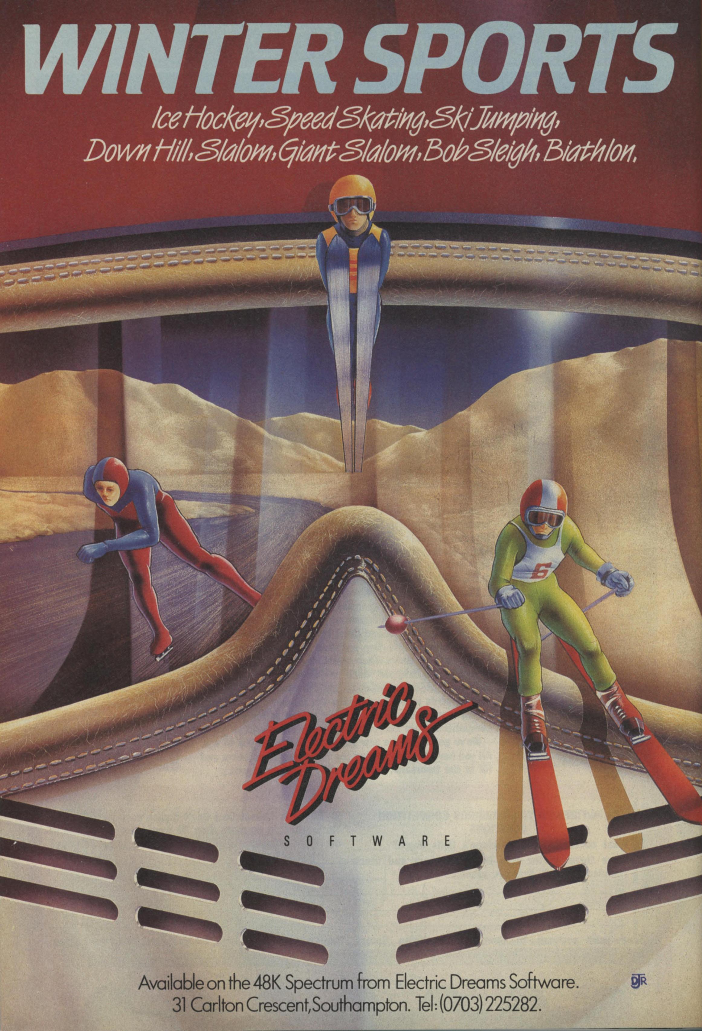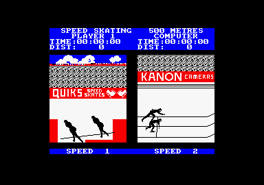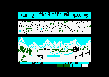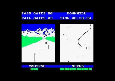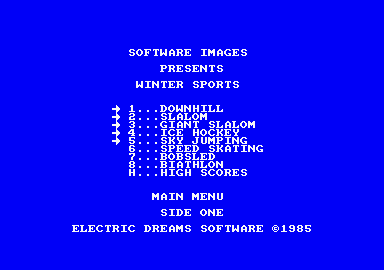 It was only a matter of lime before the sports simulation mania spread from the summer athletics action to the ice and snow frolics of winter There are eight events to lake part in and they load in five different sections from the tape. The first three events are slalom, giant slalom and downhill and all three follow a similar format to simulate the skiing The display is split into two with the left display showing the forward view and the right the overview Below this are the control and speed indicators and above it the time and number of gates passed and failed. The three events are very similar. In the slalom you have to ski around gates (marker flags) in the downhill you have to ski between gates and in the giant slalom the two are combined - you start by skiing through gates and then switch to slalom.