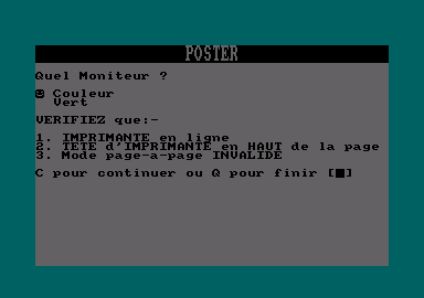 Vous avez une imprimante ? Voici les RSX correspondantes : (POSTER est une recopie graphique géante en 27 nuances, c'est-à-dire que le résultat tiendra sur 8 feuilles de papier continu et exploitera toutes les couleurs de votre dessin grâce à des symboles. Par exemple, au départ la couleur noire est symbolisée par @, Mais rien ne vous empêche de choisir un autre symbole pour obtenir d'autres effets grâce à |POSTER.SET,a$. La variable contiendra 27 codes ou symboles corresporv dant à la palette du CPC. |POSTER.GET permet lui de récupérer dans une variable alphanumérique, la chaîne contenant les différents symboles.L'Instruction |P.ON usera de nombreuses feuilles de papier puisqu'elle envoie tout ce qui est destiné à l'écran sur l'imprimante. Le moindre Ready va être affiché mais le catalogue et les listings également. L'ordre |P.OFF annule les effets de l'Instruction précédente.