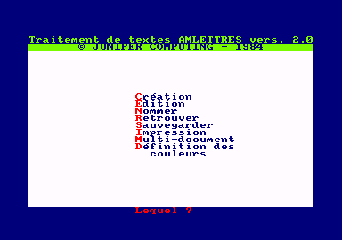 Traitement de texte. Première remarque, il est en français avec les caractères minuscules accentués. La notice est complète, mais il faut une bonne loupe pour la lire. Pour 1 50 francs, on ne peut espérer les mêmes possibilités que d'un traitement de texte à 3000 francs ; aussi, les auteurs ont fait une sélection très judicieuse des options proposées, c'est-à-dire l'indispensable, et même quelques petits luxes comme la justification à droite et un menu d'imprimante des plus copieux. Conçu pour une utilisation épisodique et non professionnelle, il est parfait pour remplacer très avantageusement une machine à écrire à la maison, pour une lettre ou un rapport de cinq à six pages. CPC n°1