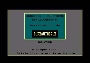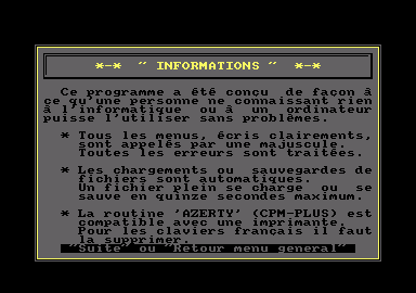 Pour tous ceux qui n'aiment pas réfléchir en programmant les utilitaires tels que les multiples gestion de fichiers, ce programme est le bienvenu et, de plus, évite de s'occuper des sauvegardes et chargements toujours critique lorsqu'on les oublie. Nouveau !! On gère aussi des fiches minitel... !
