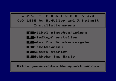Am Anfang eines neuen Monats können Mehrwertsteuer und Umsatz auf Null gesetzt werden, wobei die Rechnungsnummer erhalten bleibt, so daß sich eine fortlaufende Numerierung ergibt. Beim Erstellen der Rechnung braucht nur die jeweilige Artikelnummer und Stückzahl eingegeben werden, die Artikelbezeichnung und der Einzelpreis werden gesucht und ausgegeben, der Gesamtpreis berechnet. Zwei Textzeilen sind für Mitteilungen an den Kunden (Angebot der Woche etc.) gedacht und werden je Fakturierungstag nur einmal eingegeben. CPC-FAKTURA läßt sich leicht an persönliche Bedürfnisse anpassen, so sind z.B. durch Eingabe der Steuercodes nahezu alle handelsüblichen Drucker verwendbar. Um das Programm benutzerfreundlich gestalten zu können und gleichzeitig genügend Speicherplatz für 400 Artikel zu haben, wurde es in “Installation” und “Faktura” aufgeteilt. "INSTALL" erfüllt zwei Aufgaben: Es generiert Files, auf die “Faktura” später zugreift und dient zum Erstellen, Aktualisieren und Ausdruk-ken der Artikelliste. Der Ausdruck kann gleichzeitig als Preisliste verwendet werden. “Faktura” ist so konzipiert, daß man sofort nach dem Programmstart mit dem Fakturieren beginnen kann. Es werden nämlich alle für den weiteren Ablauf wichtigen Daten automatisch von Diskette geholt. Lediglich der jeweils letzte Umsatz muß zugeladen werden. Die Menüs sind zum großen Teil selbsterklärend und gerade angewählte Funktionen werden invers dargestellt. Mit RUN “FAKTURA” starten - Im Hauptmenü erscheinen folgende Punkte: Fakturieren/Gutschrift Diskettenmenü Rückkehr ins Basic Erklärung zu den einzelnen Punkten: Fakturieren/Gutschrift: Artikelliste und Druckercodes werden automatisch geladen — es erscheint ein Untermenü: (D)atum: Rechnungsdatum und alle weiteren Daten nach Aufforderung eingeben. (T)extzeile: Event, gewünschte Mitteilungen an den Kunden möglich. (F)aktura: Kundenanschrift und Auftrags-/Lieferdatum eingeben. Durch Eingabe der Artikelnummer werden automatisch Artikelbezeichnung und Einzelpreis ausgegeben. Der Cursor steht auf dem Einzelpreis, so daß noch Änderungen durchgeführt werden können. Soll nichts geändert werden, nur ENTER drücken. (S)torno/Gutschrift: Bedienung siehe (F)aktura, dem Einzelpreis ist ein Minuszeichen vorangestellt. Der Ausdruck erfolgt als Gutschrift, die MwSt. und der Umsatz werden von der Gesamtsumme entsprechend abgerechnet. Es ist auch möglich, innerhalb des Fakturierens eine oder auch mehrere Zeilen mit dem Minuszeichen zu stornieren. (Z)urück ins Menü Diskettenmenü: (C)atalog — Disketteninhalt anzeigen Rückkehr ins Basic--Mit Sicherheitsabfrage Mit RUN “INSTALL” starten -Im Hauptmenü erscheinen folgende Punkte: (E)ingabe: Artikelnummer, Artikelbezeichnung und der Einzelpreis werden eingegeben. Um die Frage (ALLES OK) mit Ja zu beantworten, drückt man “J” oder nur ENTER. (A)endern: Laufende Nummern des zu ändernden Artikels eingeben, gewünschte Änderung durchführen oder ENTER drücken. (D)rucken der Artikelliste: Ist kein Drucker angeschlossen,ertönt Warnsignal. (Z)urück ins Menü: Briefkopf erstellen: Wahlmöglichkeiten im Untermenü: (B)riefkopf erstellen: Die geforderten Angaben (Kopfzeile, Straße, Wohnort etc.) eingeben. Die spätere Form des Briefkopfes wird auf dem Bildschirm dargestellt. Diskettenmenü: (C)at — Disketteninhalt anzeigen Faktura starten --selbsterklärend mit Um größere Fehler zu vermeiden, sollten Sie bei Ihren ersten Versuchen nach diesem Schema vorgehen: RUN “INSTALL” (Enter) [A]rtikel eingeben/ändern (E)ingabe [D]iskettenmenü (S)peichern (der Artikel) [B]riefkopf erstellen (B)riefkopf erstellen oder (K)ein Briefkopf [C]odes für Druckerausgabe (D)ruckercodes eingeben Beispiel für den Schneider NLQ 401: (Z)urück ins Menü [D]iskettenmenü [F]aktura starten oder [R]ückkehr ins Basic RUN"-FAKTURA" (Enter) Wenn schon einmal fakturiert wurde, dann zuerst: [D]iskettenmenü (C)atalog (Filenamen ersehen) [F] akturieren/Gutschrift (D)atum und weitere Daten eingeben Nach Abschluß der Fakturierung: [D]iskettenmenü ggf. (C)atalog (Disketteninhalt) [R]ückkehr ins Basic Anmerkung: Beide Programme können nur über [R]ückkehr ins Basic verlassen werden, da aus Sicherheitsgründen ein Breakschutz eingebaut ist. (Hans Müller und Roland Weigelt), SA