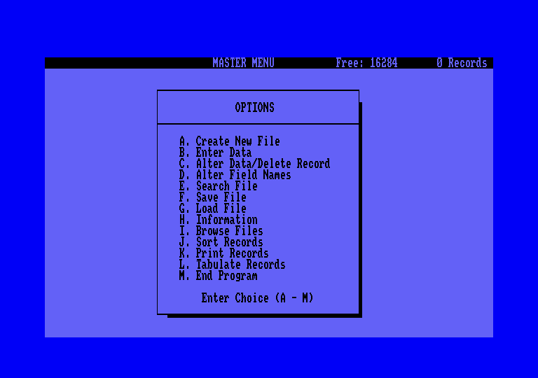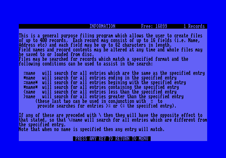 Here's a marvellous all-purpose workhorse for your delectation. Run it and take alook through the extensive menu for information about the system itself, thenuseitforwhateveryouwant Enter your own records, to a total of 400 and you should find thisavery handy source for your data.