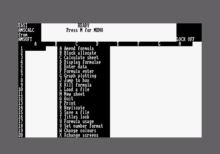 Sans prétention, ce tableur fut le premier disponible sur Amstrad. D'un intérêt relativement limité pour les très grosses applications, il n'en reste pas moins un utilitaire de bonne qualité.