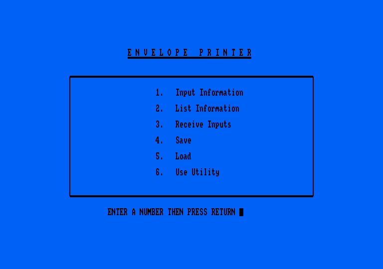 Boy, have we got a mammoth for you this month. Using William's envelope menu, you can set up spacings for the top of an envelope, set the margins, enter address information, list them, retrieve your information, print it, save it and load some newinformation. Make sure your envelopes are showing about 5mm above the printer, type in the info, or load existing info, then press 5 on the menu and type in the name of the person you want the envelope sent to. Press H for hard copy on your printer and you are away. With this masterpiece, you can use 220mm x 110mm envelopes, as well as 161mm x 115mm and 240mm x 166mm. As an added extra, there is a utility program included in the listing, with a nifty choice of commands for you to execute. Get those fingere busy, busy, busy.