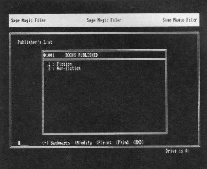 This package sets out to solve your information handling problems - but it isn't a database. It is in fact a filing system intended to organise your data into a tree structure. This would be suitable for handling a product list, for example, or the contents of a library. THE CATALOGUE Your data is filed away in a catalogue. To construct this you have to divide your data into general categories. If you're filing information on a book publisher's list, forexample, these might be Fiction' and 'Non-Fiction'. Type these two categories in and you'll have a menu which looks like this:
