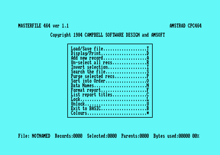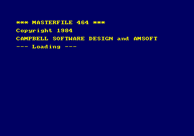 Every so often a program comes along that is a real landmark in terms of quality and price. One such is Masterfile 464, converted from the Spectrum version for Amsoft by Campbell Software Design. This is without question the best tape based database I have ever seen. Its features are almost too numerous to document, but points of real note are that it allows up to 34K of storage in each file and there are no fixed length records which means that there is no wasted space. There is 34K available for each individual file, like Tasword 464. Although the program can be transferred to disc without alteration, because everything happens in Ram files must still be that length even on disc. But this does mean that functions such as sort and search are faster than on more disc orientated software. To help with memory management there is a constant record on screen of the percentage of the file space used and the number of bytes free. Presentation is superb, although entirely in 80 column mode which is best on a green monitor, and there are many user friendly prompts supported by a well written manual which makes learning the program very easy. However, the most revolutionary feature is that the database allows 'relational' data with 'parent' and 'child' records. To use the manual's example, if you were storing data on your record collection a 'parent' would be an artist and this information would only be entered once. This record can then point towards several 'children' -the various album titles. Such a two tier system is by far the most efficient method of storing data.
