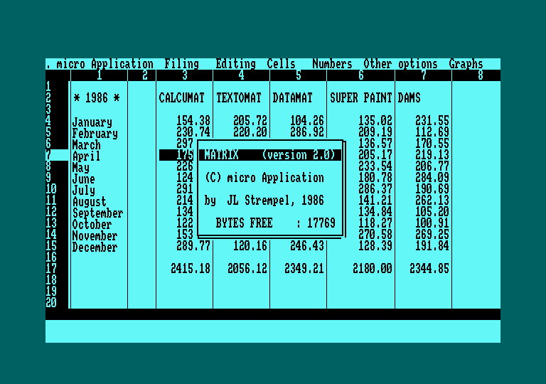 Formulae can be expressed in numérous ways. For example. R4C2+R5C2 would add the numbers held in those two cells. When entering a formula you can put the cursor on the required cell and press Copy to insert the cell number into your formula automatically - very nice. The formula above was an example of absolute referencing. Other possibilities include relative referencing, which lets you deal with cell positions relative to the cell containing the formula, and range referencing, with which you can perform a function on a block or group of cells. Range referencing is useful when you want to find the mean, maximum or minimum or even add a row of cells. There is a group of commands which allow you to perform these actions without the need for lengthy formulae. AMSTRAD ACTION #18