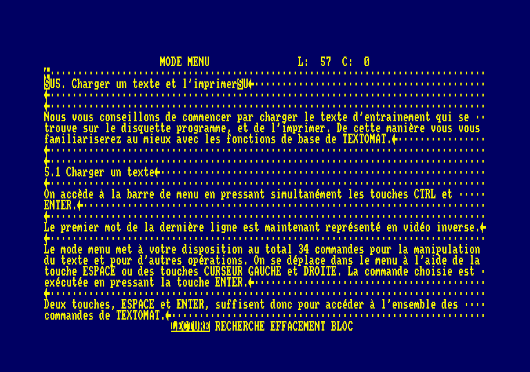 Un traitement de texte se doit d'avoir certaines qualités : être facile à utiliser, être rapide et, si possible, capable d'évoluer. TEXTOMAT est, sur ces différents points, un excellent produit. De plus, il est complété par une notice de 60 pages très bien conçue.TEXTOMAT pourra être mis entre les mains les moins expertes : il suffira d'une vingtaine de minutes à un utilisateur non averti, pour créer le premier document. Après vous avoir présenté le matériel et ses connexions, le manuel vous invite à réaliser quelques exercices : c'est, à notre avis, la meilleure façon d'apprendre. La disquette introduite dans le lecteur, il faudra environ 20 secondes pour que TEXTOMAT soit disponible. D'entrée, il vous proposera de modifier les couleurs de l'écran, si celles-ci ne vous conviennent pas ; les utilisateurs d'écrans couleur apprécieront. Par la suite, vous serez invité à choisir le clavier standard ou le clavier "FRANÇAIS" (en fait, avec les minuscules accentuées), puis les paramètres imprimante. Cette dernière opération permet de charger la configuration de l'imprimante que vous aurez définie, une bonne fois pour toutes. Vous pouvez ensuite passer à l'écriture du texte. L'écran présente des lignes de points, matérialisant la position des caractères. C'est un peu déroutant au début, mais par la suite, on n'y fait plus attention. Une ligne d'état, située en haut de l'écran donne les positions ligne et colonne. Le menu est de type arborescent, ce qui est très confortable à l'usage. Les déplacements sur la page se font grâce aux touches de curseur : d'une ligne vers l'autre, d'une page vers une autre, ou d'un mot vers l'autre. Le mode insertion est commutable. La suppression est on ne peut plus simple. Des caractères de contrôle peuvent être inclus au texte : ils permettent de rappeler des fichiers externes, par exemple pour imprimer une adresse ("mailing"), d'imposer des formatages spéciaux au texte, de marquer des blocs de texte (pour les déplacer, supprimer, dupliquer, etc.) et, bien sûr, pour commander l'imprimante. Il est alors très facile d'imprimer un mot en gras, de souligner, de passer en italique, etc. Il sera nécessaire de tenir compte des possibilités de l'imprimante. Avant d'imprimer un texte, il est possible de le visualiser à l'écran tel qu'il sera (à quelques détails près) sur le papier. Les mouvements vers la mémoire