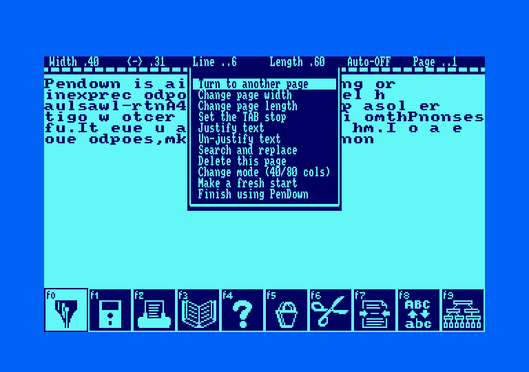 Logotron is probably best known (or its dealings with the BBC Micro supplying schools with the popular Logo graphical language. It has now made a logical step to produce a 'child-centred word-processing environment for junior, middlo and infant schools.' which look set to put Logotron on the map. and provide an invaluable aid a learning both at school and at home. Many word-processors are designed for professional typist intending to create lengthy documents. The printed copy, in generic bears little relation to the text displayed on screen. This happen bccauso control codes are normally embedded within the text powerful tools in expert hands but rather daunting for the beginner Because Pendown dispenses with such problems, making easy to explore possible layouts on screen, it is ideal for both your children and the novice computer user. Pendown is a what-you-see-is-what-you-get system. (TM acronym for that is WYSIWYG, which some people try to pronounce as 'wzzywig.') In other words what you see on screen will be see to the printer. The only unfortunate exception in Pendown is the different fonts - bold, expanded, etc - are not shown on screen Pendown's screen shows 10 detailed pictures - 'icons'- at the bottom. Each icon corresponds to a function key. calling routine for disk management and text handling. The top of the screen reserved for system information; cursor position and page width length and number. Between the information box and the icons is the page are. A page can bo anywhere from 1 to 255 lines in longth: its width can be 1 to 80 characters. You can define up to 255 pages - but if you have 255 pagos. they can have only one line each! A compromised must obviously be made. As most people use A4 paper as sing sheets in their printers, a usoful page length would be 77. Of cours there are not enough lines on the Amstrad monitor to show all the lines of a pago; if you wish to see another area of a page, just move the cursor to the bottom or top of the text window and the new section will flick into view. The first icon, which looks like the nib of a fountain pen represents the writing menu. From hero you can choose page width page lengih. tab stops, mode (that is 40 or 80 columns), search-and-replace and justification. Search-and-replace is restricted to complete words. Parts a word cannot be altered using this system. Otherwise if you wished to alter is to was. for instance, there would be cases where this would turn into thwas. causing confusion to the beginner. A disk is depicted by the next icon: the disk filing menu. Options include cataloguing the disk, switching between drives, saving, loading and erasing files. To choose an option is simple: just move the cursor. When the function you want is highlighted, press the Enter or Return key. Printing is a joy. All options come under the icon appropriately displaying a printer. You can print a single page or several pages of text, normal or double spaced. The option 'Epson-special'gives a choice of character sets: Moderna, Jumcomp, Jumbo, Horizon, Gothic and Chunky. You must be careful not to try to put too many of these characters on a line, for they are much larger - they also take twice as long to print. The results are good though. The fourth icon gives an interesting and very handy option: the dictionary menu. It is not a spelling checker nor does ii provide definitions of words. It lists words - alphabetically or in groups selected or organised by you. Any number of dictionaries are possible , each with up to 850 words. Words can bo added or deleted. A child can easily look up a word and go back to his or her text, but has to remember the spelling and type it in himself. For help, choose the icon showing a question-mark. One choice is 'help on help,' which provides a step-by-step guide to producing your own Help file. Or you may want to know how to create a dictionary. When you cut or copy text it is stored in a 'bin' - a part of the computer's memory. The contents of a bin can then bo incorporated into your text at any time. Up to 50 lines of text can bo hold at a time - roughly equivalent to 350 words. Choose the icon displaying a couple of bins to empty the contents. Or you can rummage through their contents. The next icon is a pair of scissors. To cut out (delete) a word or block of words, put the cursor somewhere on the first word. Press the scissors key and the word becomes highlighted. Move the cursor to the right and further words are highlighted. Finally press Delete to delete the highlighted block. Or to copy them to another position, press Return to indicate the end of the block, then move the cursor to where you want it and press Copy. To centre text, place the cursor on the required line. A quick press of the icon showing two arrows facing each other, and it's done. Another fairly useful icon is case change. If a letter is in upper-case (a capital letter), this function key will change it to lower-case - or vice-versa. The final icon is the Planner. Us function is to lay out in tree-structure form a plan of how an article or essay could be written. It's a pre-writing facility. Say you wished to write an article on "People". Using Planner, you begin with the title. From there you branch out. for example, families, friends, personalities. The next branching from families could be immediate family, relatives and so on. Planner is an excellent way to expand your ideas and is an invaluable teaching aid. As if there weren't enough to Pendown already. Logotron has included utility programs on the disk. They include a dictionary editor, help-file editor and font editor. The last of these is of tremendous use if you wish to create new character sets to send to the printer. Pendown is aimed at the young or inexperienced word-processor user and it manages it very well. The manual is a well-written A4 booklet. Many of the 'grown up' programs could learn a thing or two about clear, concise presentation. There is nothing t