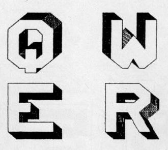 La transformation o=2 permet seulement un élargissement des caractères (décalage à droite et à gauche). Les transformations o=3 à o=8 donnent une impression de relief. Ces transformations diffèrent principalement par les valeurs de DECX et de DECY fixées dans «CP1». L'Impression de relief d'un objet dessiné en 2 dimensions dépend de l'angle avec lequel il semble observé. Vous pouvez choisir dans le menu l'angle d'observation et lui donner une valeur de 1 à 8. Le complément de programme «CP1» multiplie ce chiffre par 45 pour produire un angle en degrés. Les valeurs fixées de DECX et de DECY sont alors multipliées par le SINus et le COSInus de cet angle. Les valeurs paires permettent d'observer les caractères de droite, d'en bas , de gauche ou d'en haut, les valeurs Impaires, plus intéressantes, permettent l'observation en biais (45,135,225 ou 315 degrés) et donnent une impression correcte du relief. La figure 2 montre le résultat obtenu pour ces valeurs Impaires avec la transformation o=6. Ces transformations augmentent la largeur du caractère et diminuent par conséquent l'espace disponible entre deux caractères. Ceux-ci risqueraient alors de se chevaucher. Une limite en X est Imposée (LIMX). Elle permet de décaler les caractères à gauche s'ils sont penchés à droite et vice versa. SI l'Intervalle entre deux caractères est Insuffisant pour permettre la transformation, cette limite impose une restriction et l'effet est différent de l'effet attendu. Il est donc nécessaire de prévoir un intervalle assez grand (= ou > 2/8 de la largeur du caractère). SI vous voulez obtenir des caractères chevauchant, vous pourrez supprimer ces limites mais, attention, les caractères seront tronqués entre deux pages si vous Imprimez un texte sur plusieurs pages successives. La transformation o=9 permet seulement d'encadrer les majuscules des caractères simples. Toutes ces transformations sont compatibles avec les autres options (pleins ou vides, penchés et relevés). Vous devez cependant prévoir un espace plus grand si vous désirez un caractère à la fois penché et en relief. Les transformations 7 et 8 sont un peu particulières. Elles donnent des effets Intéressants, mais sont d'un usage limité et souvent plus spectaculaire à l'écran qu'à l'Impression. La transformation o=10 donne une impression de relief par un principe très différent. Les DATA correspondants au caractère doivent être mis momentanément en mémoire dans un tableau. Pour cela rajoutez la ligne 35125 dans la boucle de lecture des DATA: 35125 IF o(n)=10 and zeLe caractère est dessiné deux fols avec un décalage qui est. comme prédédemment. fonction de l'angle d'observation. Les deux dessins sont réunis point par point puis les lignes superflues effacées.Cette ligne diminuant la vitesse de dessin de tous les caractères, mettez-la en remarque si vous n'utilisez pas cette transformation.