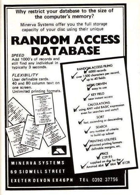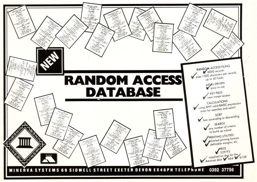 One of the major computing flaws of the Amstrad CPC machines has been the inability to handle simple Random Access Filing even when equipped with disc drives. The only way random access data handling was possible was if the program was written entirely in CP/M. Most people like myself totally despise the CP/M operating system for its 'User Hostile' environment, lack of graphics and being a totally inflexible system as far as programming is concerned. Now, along comes a database, written in BASIC, and claims to have Random Access facilities, which is able to access, in theory:- 9 Mbytes (nine million bytes) of storage memory! Or to those who think of k rams; 9 Mbytes equals approximately 8800k of disc storage. Now this might sound as unrealistic as a rooster laying golden eggs, but if you know what Random Access is all about, then it is not such a far fetched claim. What Is Random Access The Arm trad machines have a file handling system called SEQUENTIAL ACCESS. This means that even the simplest data handling programs have to load all the data information from disc, manipulate it and finally save it all back to disc. In other words, all the data is in one file and that file has to be loaded into the machine all at once, as if the file is a whole program itself. Now this may seem an easy concept to understand, but the program is obviously restricted by the amount of free memory space available, and the amount of data it can store. RANDOM ACCESS on the other hand is a different system altogether. The tile docs not have to be loaded all at once. Instead only the relevant data selected will be loaded, manipulated and then saved to disc. This is slightly slower in operation, but it greatly improves the storage capacity of a program. If for example, you would use a whole disc for data storage, then 178k would be used for data storage, while the program can use the machine's memory for other purposes. Therefore Random' Access Database would use 182272 bytes for data storage on the one disc! Minerva Systems have come up with a database, which uses random access file handling, so it's not limited by the available memory of the machine, but rather the storage capacity of the disc. Called simply RANDOM ACCESS DATABASE, it is by far the most powerful database available for the CPC series, that 1 know of. And believe me, I've known quite a lot of databases in my life. The Program When I first received the package, I thought that this was just another database for the Amstrads. At first glance, the program comes complete in a plain pink cardboard box, with a 32 page manual and one disc, it was not impressive. Inserting the disc into my trusty Arnold, I vowed that if this database is just the same as any other.... out it goes. That was two weeks ago. One hour into the program and I was rapt. This is THE DATABASE. Personally, I've never seen anything like it, a flexible powerful database, that allow your imagination to manipulate data any way you choose. Minerva have managed to produce random access facilities by incorporat ing some very' clever machine-code programming, through RSX's (Reside System Extensions). And by subdividing the database into sections of small programs which can he used independently or together, the results allow far more flexibility and extra memory on-board for the program to use. Features The difference between Random Access and all other CPC databases is in its power and flexibility. No other databases available for the Arnold on the market can come close to Random Access. Here are some features which prove how powerful Random Access really is: