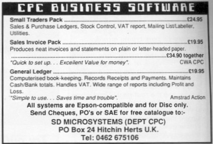 THE latest version of the Small Trader's Pack from SD Microsystems is a suite of utility and accounts programs. It is designed for businesses with a relatively small number of customers and stock items, and pretty unsophisticated demands. At the heart of the package are sales ledger, purchase ledger, mailing list, and stock control modules. Of necessity none is very complex, but all do a solid job probably adequate for the targeted users. There is, however, one important proviso: Sometimes you find that no matter how good a program is, you simply cannot work within its data limitations. This is really a matter for individual companies to decide. For example Small Trader tends to stick to a limit of 100 for number of accounts, number of customer addresses and so on, which may not be sufficient. This is not a flaw in the software - it is aimed at small businesses after all - but remember that you have to be small enough. Make the sale The sales ledger is essentially a record of what items or services have been sold to which customers, and whether they have paid. The program can list or print the history of sales made, a statement of sales for any one customer, a financial summary of incomings and sales for any month - or for the whole of the file - and a summary of the money owing, again by account or in total. It can also automatically calculate VAT paid on eligible items. There is provision for cash sales to customers. who do not have an account number. Up to 10 definable categories may be assigned to each sale, such as mail order or credit card sales, and these can be analysed to show trends in your business. The purchase ledger has an almost identical range of features, designed to record things that you have bought from other people. The mailing list keeps track of customers' names and addresses, and allows you to produce labels for mailing statements and so on. Stock control, taken care of by another module, keeps track of the items you have for sale, who supplied them, and how much they cost and sell for. The total cost and sales value of any or all items in stock can be quickly calculated. Minimum stock quantities can also be defined, so you get a warning when you need to reorder, and the re-orders required can be listed by supplier or in total. Send the invoice It is possible to buy the Small Invoicer separately, but is very much cheaper as a joint purchase with the Trader's Pack. It duplicates some of the functions, most notably the sales ledger, disc utilities and mini-calculator. Its primary use is - no surprises here -the preparation of invoices and statements (a statement lists all purchases and payments attributed to any one customer account). Credit notes can also be produced very simply. Invoices are laid out attractively, and the program includes useful features such as automatic multiplication and totalling of the items listed. My main quibble is that the allowance of five lines for customer addresses is not enough. The invoicer can be used in a laborious no-frills way if the required information is entered from scratch each time, and this is in fact necessary for cash customers. However, the clever bit is that the program can use files made with the sales ledger to update customer records automatically, or to look up the appropriate account names when given the account number, and so on. This is a nice feature, but if anything it highlights the deficiency of the integration in the other modules. One of the major advantages of most, more ambitious, accounts and stock control suites such as those available under CP/M, would be the automatic updating of all records. Even so, I was quite impressed with the range of features and the very competitive pricing. Once I became used to the program's quirks it was all very easy to operate, but unfortunately there were plenty of quirks there to get used to. Not without warts The program at first refused to load on my, admittedly ancient, CPC464 because of the use of some commands from the revised 664/6128 version of Basic. Having to edit the listing before you can run the software will not go down well with busy traders. A major strength claimed for the pack is its menu-driven simplicity, and the fact that a busy user does not have to keep referring to a huge manual. Unfortunately the documentation does not give as much support as I would like. For instance, at one stage you are prompted for a product description. The documentation reveals that this can be up to 12 characters long, but in practice the program lets you type for several lines and then rejects them with no message explaining why. It would have been simple to write the program in such a way that it allowed you to edit a 12-character field. At other times irritating computer jargon is used rather than plain English, such as ENTER FOOTER$(2). There are other examples I could quote, but you get the point. More thought and a bit more work would solve all of these problems and produce an excellent product. Among the utilities are a phone book that can hold name, number and a line of notes, a simple calculator, and an imperial/metric conversion utility, which is a nice touch. Small Trader's Pack is written in Basic. The days when programs could be sold on the strength of being written in machine code are fortunately over, largely because most of them now are. I'm certainly not an anti-Basic snob, after all it is probably better that an expert in accounting learns the rudiments of programming than that an expert programmer learns only the rudiments of accounting. Small Trader's Pack provides a lot of features for your money, but they are all very simple and aimed at undemanding users. More advanced stock and accounts packages are available under CP/M. They cost more, and often need two disc drives, but buying a utility that does not do what you want is false economy. CPC COMPUTING |