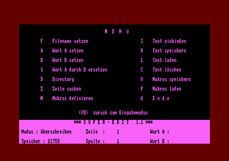 lädt eine entsprechende Liste von dort.löscht nach einer Sicherheitsabfrage den gesamten Text im Speicher. Erfreulicherweise unterstützt “Super-Edit 1.1” deutsche Umlaute, ß und Paragraphenzeichen. Die Tastenbelegung: - Ä/a = eckige/geschweifte Klammer auf