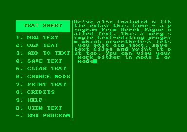 We've also included a little extra this time - a program from Derek Payne called Text. This a very simple text-editing program which nevertheless lets you edit old text, save text files and print it out too. You can view your work either in mode 1 or mode 2, and there's even an on-line help system! It also works from both tape or disk.  Text, from Derek Payne, is a basic text-edi-tor with a friendly front end.