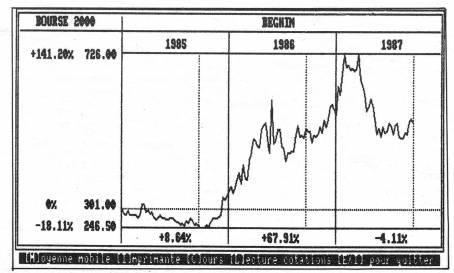 Nous avons été assez étonnés de voir que la présentation de Bourse 2000 version PCW est en tous points semblables à celle des CPC : mêmes écrans, mêmes cadres, mêmes menus et fenêtres. Le plus étonnant, pour le PCW, est la partie Graphiques. Si l'option Points et figures (un bon point !) n'est pas véritablement étonnante au niveau graphismes, l'option Courbes donne des résultats impressionnants... Certes, la vitesse de mise en page d'une présentation et le tracé d'une courbe diffèrent (beaucoup) entre versions CPC et PCW, mais le résultat est là : très lisible et assez étonnant pour le PCW dont les possibilités graphiques sont généralement inemployées. Ces graphiques sont, évidemment, obtensibles sur imprimante, en hardcopy (EXTRA + PTR) ou par l'option "impression". Dans ce cas, le résultat obtenu est une recopie d'écran en format A4 (le dessin est plus lisible mais les courbes perdent en définition...). Seul reproche, de conception celui-là : la représentation graphique n'existe que sur trois années. Une décomposition plus précise, sur une année ou une période donnée, aurait été souhaitable au niveau du suivi graphique.