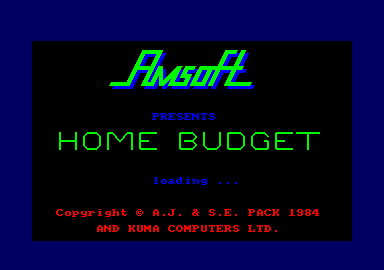 This program is designed to enable you to create and maintain annual files containing estimated monthly expenditures and incomes. The file is saved on tape for later retrieval each month to allow replacement of forecast amounts with actual amounts. You may choose the starting month of the budget year, and a 'Rolling Budget' can be produced to allow you to 'see' 12 months ahead at any time. Individual inputs cannot exceed £9999.99. At the outset of the program you are given the extra option of using a printer, since printed displays can be obtained of monthly results and year-end totals. However, the addition of a printer is not essential as monthly displays can be easily viewed on the screen. Similarly, for rapid visual checks of your estimated annual household budget a 'barchart' option can be chosen. This option is attainable for viewing only and can not be used in conjunction with a printer. A number of 'help pages' are available throughout the course of the program. To obtain access to the information that they offer, you must key [H]. Return to the main program from these 'Help' pages pages by pressing any key.