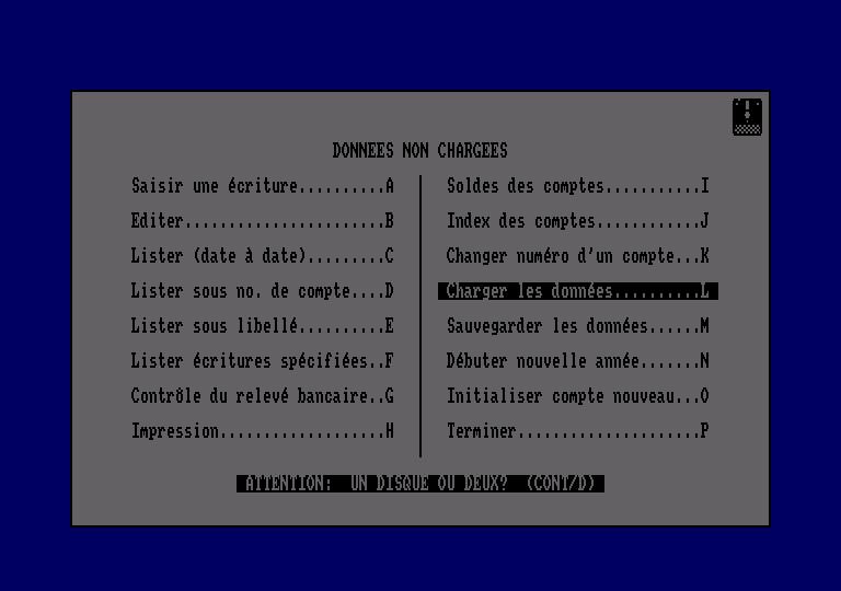 Il ne reste plus que les options classiques de chargement et de sauvegarde des données, avec un petit rectangle en face de l'option sauvegarde pour ne pas oublier d'archiver ses précieuses données. Enfin pour terminer, signalons la présence de deux options d'initialisations : pour une nouvelle année sur le même compte (avec report du solde en début d'année suivante) et pour un nouveau compte 01 est préférable alors d'utiliser une autre face de disquette). Il est vrai que Fairbank est simple d'emploi et dans le même temps suffisamment rapide et puissant pour une utilisation quasi-professionnelle. Sa capacité de 1236 écritures par an sera également utile pour la gestion d'un ou de plusieurs comptes.