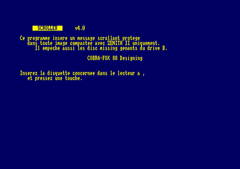 Ce programme insere un message scrollant protege dans toute image compactee avec ZENITH II uniquement. Il empeche aussi les disc missing genants du drive B. | ★ AMSTRAD CPC ★ DOWNLOAD ★ |
