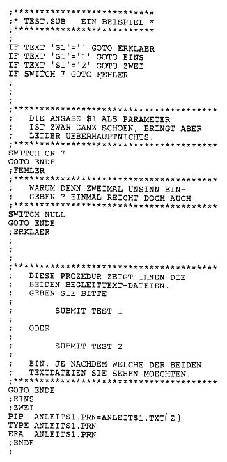 Die Hochkommata müssen geschrieben werden.Beispiele: IF EMPTY ERRFIL.PRN ERA ERRFIL. PRN ELSE TYPE ERRFIL. PRN IF NOT FILE $7. ASM GOTO FEHLER IF TEXT '$2' = 'LOESCH' THEN ERA *.PRN | GOTO Syntax: GOTO label Label ist ein symbolisches Sprungziel. Dieses Sprungziel muß in der Prozedurdatei als Kommentarzeile enthalten sein. Eine Kommentarzeile beginnt mit einem Semikolon. Weder GOTO noch das Sprungziel dürfen die letzte Anweisung der SUB-MIT-Datei sein. Falls dieses notwendig ist, fügen Sie bitte eine leere Kommentarzeile an. Beispiel: (beliebige Anweisungen) GOTO ENDE (beliebige Anweisungen); ENDE; SWITCH Syntax: SWITCH (?) (NULL) (ON n) (OFF n) - '?' oder leer gibt die aktuellen Schalterstellungen aus. -NULL löscht alle Schalter.