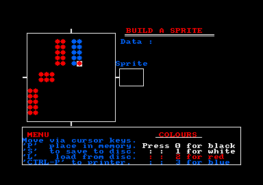 This program was developed mainly because of the need to design new sprites for the "Roland on the Run" game which recently appeared in a number of parts in the English Amstrad Computer User, and to find out how the screen memory is used and addresses when using multicoloured sprites. As 'Roland'is in Mode 1, this program is also designed to build sprites in that Mode. In Mode 1, one byte controls the colour of four pixels. Each pixel is controlled by two bits. Bits 7and 3 control the leftmost pixel; the next pixel across is controlled by bits 6 and 2; the next by bi ts 5 and 1; and finally the rightmost pixel by bits 4 and 0. For example, take the binary number 00000001 and look at bits 4 and 0 as a pair. Putting them side by side (01) the two bits can no w be read as a normal binary number. In this case the answer is 1 which represents INK 1 for the rightmost pixel. If the binary number was 00010000, then bits 4 and 0 would read 10, which, when read as abinary number gives 2, making the rightmost pixel INK 2. The monsters in 'Roland'use 64 bytes - this program builds sprites of the same size for use in the 'Roland'game. Inside the Program When a pen number is keyed in, it is given a predetermined decimal number and will produce the correct binary number for the bit. When the 'P' (Place in memory) is pressed a FOR...NEXT loop is set up producing 256 bits, which in turn are combined in fours to produce 64 bytes. The bytes are converted to a hex number and stored as the data. Running the Program On running the program, you will notice a flashing cursor in the top left hand comer of a large square. The square is the working area in which the sprite is built. The cursor is moved about the screen via the cursor keys. There is no need to follow a pattern - just move the cursor around and input the pen number you wish a pixel to be at a chosen point.(0=Black, l=White, 2=Red and 3=Blue). With the background already black there is no need to fill it. Build your sprite with the other three colours using 0 (black) to wipe out any errors. At any time during the building of your sprite 'P can be pressed. This will pole the information into screen memory producing an actual size sprite in the small square. The cursor then returns to the work area allowing alterations. Continue building your sprite and when happy with it, press'S' which will save the data to disc or tape. If you find that you are not happy with the sprite, then press 'L' and the data will be loaded allowing further alterations. Pressing the control and V keys sends the hex data to a printer. The hex data produced by this program (representing your sprite) can now be placed into the unassembled listing of 'Roland', or it can be poked in after the Roland program is running. The size of the sprite is two characters high by two characters wide. We suggest that you make a drawing of your sprite in a 16 x 16 grid prior to running the program -it will make the building process easier.