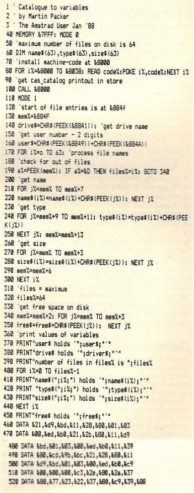 This program by Martin Packer will place the contents of a disc catalogue into Basic variables. Ideal for incorporating into your own programs so you can keep track of the disc's characteristics. To get the hang of the routine, run it several times with a disc in the drive. After a few seconds, variable names and their contents, will appear on screen. Using it in your own listing shouldn't be too hard. Once you have the variables assigned, you can use them, say to build up a database containing all relevant information on your discs.