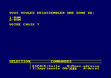 Voici pour les amoureux du langage machine un petit désassembleur écrit en Basic qui leur permettra, entre autres, de percer les mystères du CPC 464. Dès le lancement par RUN, un choix est demandé par l'ordinateur quant au type de zone où doit être lancé le désassembleur (RAM ou ROM).