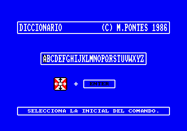 Este programa da un breve resumen de todos y cada uno de los comandos disponibles en el Basic Locomotive del Amstrad CPC-464. Los comandos extras que posee los modelos 664 y 6128 no están incluidos en el diccionario. La forma de seleccionar un comando es muy fácil. Para ello se emplean las teclas de cursor, provistos como standard en el teclado del Amstrad, o bien en joystick, ambos sistemas proporcionan un control total sobre el programa. En la pantalla principal aparecerá un abecedario. Eligiendo una letra del mismo, elegimos la inicial del comando. Para ello, pulsar los cursores horizontales (o el joystick), de forma que la letra elegida aparezca resaltada. Una vez hemos elegido la letra inicial, hay que pulsar ENTER o bien el botón de disparo del joystick. Hecho esto, aparecerá otra pantalla en la cual hay una ventana conteniendo todos los comandos que empiezan por la inicial elegida. Entonces seleccionamos el comando deseado con los cursores verticales o el joystick y pulsamos ENTER (o el botón de disparo del joystick); acto seguido aparecerá un breve descripción del comando.