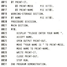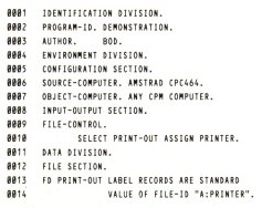 Around 1966, Grace Hopper (who coined the phrase "bug", when she found that the reason for a program crash was a dead insect shorting out a relay) created a high level language for the American Department of Defence and called it Cobol; an acronym for Common Business Oriented Language. Its main advantage is that the program source code is very close to English, which makes it very easy to read and therefore de-bug. This, among other reasons is why Cobol is still widely used for writing business applications. Unlike most implementations of Basic, which are interpreted, Cobol is compiled. The difference being, that interpreting a program means turning every instruction of the program into machine code as it is run, as opposed to turning the whole program into machine code before running it, as compiling does. The main difference between these two methods is speed. As no conversion work has to be done during the running of a compiled program, it executes much faster. Cobol is available only for a few home micros, but due to the availability of CP/M on the Amstrad machines, it is now another language option, open to the serious Amstrad user. Although Cobol is faster than Basic, do not go and buy it thinking that you will be writing super fast, graphics and arcade games. Cobol is a business language and has little or no support for graphics. The implementation of Cobol available on the Amstrad, is Nevada Cobol. It is one of the more popular versions of the language, if not the most complete. Other versions, such as CIS and Microsoft have larger and more powerful instruction sets, but do cost many times more. Cobol is quite a verbose language and at first sight seems over complicated. To demonstrate, a program to input and then print a person's name would be. (Please note. The line numbers are only for de-bugging and are not used like Basic line numbers within the program.) As you can see, this is a bit more long winded than it would be in Basic, but do not be intimidated. The start of the program (The IDENTIFICATION DIVISION), contains data for anyone looking at the source code and shows what the program is, and who wrote it. This is followed by the ENVIRONMENT DIVISION that contains more data for the programmer about what computer the software was written on and what hardware is needed to run it. This division may also have an input-output section containing details about any files to be used in the program. The above example also contains "file-control" that tells the computer facts about files to be used. This information includes the type of file (usually disc or printer) and for disc files, the type of file to be used, be it Sequential or Relative, the access type, be it sequential or random, as well as relative file key, and file status variable assignments.