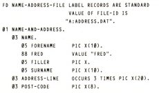 Cobol differs from Basic in that all data used must be declared at the start of the program, in the next division, the DATA DIVISION. As well as defining all internal data, all files (disc, printer etc.) must also be defined in detail. This makes structuring of data clear and easy to read. The first part of the Data division only exists if there are any files and is, not unexpectedly, called the File section. As an example, a file that had records containing a name, a three line address and a post code would look like this.