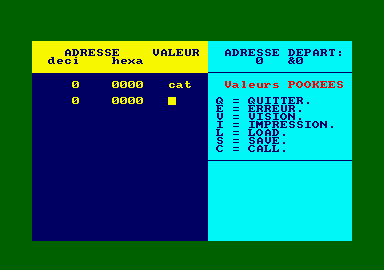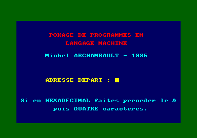 LE MODE D'EMPLOI C'est plutôt une présentation, car toutes les options figurent à l'écran. De plus, toute frappe non valable est refusée et signalée par un bip sonore, le PRINT CHR$(7). Toute première phase : Entrée de l'adresse départ, en hexadécimal ou en décimal. Vous pouvez, par exemple, indifféremment taper 38912 ou &9800. Après le "&", pas d'espace et obligatoirement quatre caractères. Sitôt après une passe à l'écran de saisie en quatre WINDOW, très coloré (on vous gâte... ). Moitié gauche = saisie, moitié droite = les interventions. La partie saisie est en trois colonnes : adressé en décimal, sa traduction en hexadécimal et les valeurs à entrer, le curseur vous y attend. Rappelons que c'est le programme qui affiche l'adresse en cours ; pas vous. Ces trois colonnes sont légendées en haut de l'écran. La partie options est en trois zones. En haut, on rappelle la fameuse adresse départ. Au milieu, les légendes des lettres (en majuscules) pour chaque type d'intervention, E pour erreur, V pour Visionner, S pour Save, etc., plus un rappel vous signalant que vous êtes dans MACHPOKE ou dans MACHDIM. La partie inférieure pour l'instant est vide, c'est la zone réponse aux questions, suite aux interventions. Exemple : au lieu d'entrer la valeur suivante dans le tableau de saisie, vous avez tapé E et ENTER : dans cette zone apparaît : "Erreur : Adresse en décimal ?". La page de saisie comprend vingt lignes (scrolling). De temps à autre, vérifiez qu'un oubli n'a pas provoqué un décalage adresse-valeur. Les valeurs sont obligatoirement en DEUX caractères hexa (et en majuscules) ; ne tapez pas le "&", c'est le Basic qui le met. Si vous n'entrez qu'un seul caractère, le programme consulte s'il est dans la liste des caractères d'interventions. Si ce n'est pas le cas, bip sonore et recommencez. Il ne peut pas faire une erreur en comptant ses adresses, il vérifie tout. En "vision", il va lister votre saisie à partir de l'adresse que vous lui avez indiquée. Il présente 20 lignes et s'arrête (pas comme LIST en Basic...). La zone question vous présente alors trois options : "S" pour Suite, "E" pour Erreur décélée, ou "F" pour Fin de vision, et retour à la saisie ou autre option. Les options SAVE et LOAD vous demandent le nom du programme. On l'a limité QUELQUES CONSEILS DIVERS – Ne faites jamais un CALL avant d'avoir fait un SAVE (prudence... ).Les programmes MACHPOKE et POKEDIM se chargent de cette écriture. En revanche, LOAD est bien plus simple ; à partir de l'allumage de l'AMSTRAD, tapez simplement LOAD"TRUC", et il ira se loger au bon endroit, puis CALL adresse. C'est pour cela qu'il fallait le noter par écrit. – En cas de discontinuité dans les adresses (rare), tapez ENTER en saisie. CONCLUSION Avec de tels outils et ces quelques notions, vous devez (enfin) profiter des listings ep Assembleur ; même sans le pratiquer, ni le comprendre, il ne vous impressionnera plus.