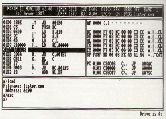 The text editor shown in Figure I is an implementation of Protext's program mode. I've used word processors and text editors on various machines and haven't seen anything that is both as powerful and as friendly as Protext. It's a delight to use and is excellent for entering text quickly. It can work with two files in memory and it's possible to copy text from one to the other. Files larger than available memory can be handled, though I prefer to split a file into sections to avoid the reduction in speed caused by disc accesses. Blocks of text can be loaded, saved, moved, copied and deleted. One thing I particularly like is the undelete function which allows recovery from those awkward situations which tend to arise when you haven't made a back up for a few hours. There's also a facility to add or remove line numbers if you want to edit a Basic program saved as Ascii. The assembler takes its source code from disc or a file in memory. Object code is written back to disc, the default being a .com file. Amor intend to supply a utility to convert files to a format readable by Amsdos though the monitor won't be any use for non-CP/M programs. A number of commands can be embedded in the source code which instruct the assembler to perform certain actions. These are known as pseudo-op codes or directives. All assemblers have these to some extent - ORG and DEFB being two examples. Maxam ll's extensive list of directives is almost d mini language. Conditional assembly and REPEAT . . . UNTIL loops let you produce different versions of a program from a single source file, and others give full control over the listing output. Large files may be Heveloped in sections and either assembled separately and linked together or the assembler can read multiple source files with the READ directive. Macros are a welcome addition because they can shorten the time it takes to write a program and make your code a lot more legible. A macro is a sequence of instructions referred to by name. For example, if you wanted more flexibility in adding 16 bit register pairs you could define a macro to add the contents of BC to DE and leave the result in BC. MACRO add_bcde push hl ld l,c ld h,b add hl,de ld c,l ld b,h pop hl MENDWith this macro defined at the start of your program add_bcde can be used just like another mnemonic. Whenever the assembler meets it the list of instructions corresponding to the definition is inserted.It's also possible to put your macros in a separate file so you can build up a library of useful routines. Another feature of macros is that the actual sequence of instructions can be varied according to a set of parameters. For instance, to add together any pair of eight bit registers leaving the result in the first register a general purpose macro could be written like this: MACRO add_r1r2 ®1 ®2 ld a,®1 add ®2 ld ®1,a MENDSo in one place you "might use:add r1r2 b cwhich would add B to C and leave the result in B. Somewhere else in the program you could use:add_r1r2 l dwhich would do the same for the L and D registers using the same macro definition. Parameters are only used during assembly and shouldn't be confused with those passed to functions and procedures in high level languages.Another powerful feature is the ability to link machine code with files produced by Arnor C. The problem with putting in-line machine code in a C program is that C does not incorporate an assembler. You can write the code with an assembler and either incorporate the hex values in your C function or leave an area of memory free and load the code as a separate binary file. Alternatively, you can give all the op-codes definitions such as: #define ld_a 0x3Eand write pseudo-assembler using the labels.None of these methods are very satisfactory, particularly when it comes to writing and de-bugging more than a few lines of code. The Arnor method is to use Maxam to write machine code and store it on disc as a link file. In the file will also be a list of labels that you have declared with the assembler directive PUBLIC, along with their offset from the start of the code. The linker supplied with Arnor C can then access the labels and incorporate your machine code in a C program. There are one or two constraints when writing assembly language for use with C. It has to be relocateable and can't be longer than 32k, though you can get round this by linking multiple files. Arnor products seem to score again and again when it comes to combining powerful facilities with ease of use and they've excelled themselves with the monitor. The old monitor was rudimentary but the new one is in a different league. In fact two monitors are supplied, small and large. The small monitor lacks the less commonly used features of the large model to make room for larger object files which obviously have to be in memory at the same time. Like the text editor, there is a separate command mode and dozens of commands too numérous to list here. Several debugging tools are available such as conditional breakpoints and single stepping. These make it possible to execute a program slowly or quickly with the monitor retaining control so you can stop the program with a key press or at a breakpoint. This may be a particular address in the program or when a predefined condition arises, such as a register reaching or exceeding a certain value. You can examine and alter registers or memory and then continue execution. There's a disassembler which can output to screen, printer or disc and a single pass assembler which lets you edit memory by typing in assembler mnemonics rather than hex codes. Figure II shows you the idea. CP/M plus operates with banked memory allowing it to use more than the normal 64k available with the Z80 microprocessor. The monitor will let you investigate all the memory map by switching in banks of RAM as required, and that includes the PCW's RAM disc. To round things off, several utilities can be accessed from the editor or monitor, includin