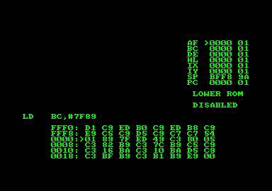 To run the program rewind the tape and type RUN "MEGAMON" When the program has loaded the little screen will appear and you will be asked for an address at which to load Megamon. this can be any address from 4000H up to 9000H. Obviously the monitor will not work if loaded underneath the lower ROM. Once the address has been entered the object code for Megamon is loaded and you will be presented with Megamon's Front Panel screen display: Z80 Registers — The top right of the screen shows the Z80 registers AF,BC,DE,HL,IX,IY together with the stack pointer (SP) and the program counter (PC). The register contents are shown (at start-up these are always zero) and then the contents of the memory location addressed by that register, there is also the register cursor (","), which points to AF on start-up. It's use will be discussed shortly. Lower ROM State — Below the register display the state of the lower ROM is shown, either Enabled or Disabled. Memory Display — The memory display occupies the bottom of the screen and its purpose is to display the bytes around the memory pointer, indicated by ,. The bytes can be displayed either as hex or as ascii. PC Instruction — The instruction at the Program Counter is contantly displayed above and to the left of the Memory Display. List Display — The left of the screen above the Memory Display is taken up by the List Display. At start-up this display will be blank, but if you are eager to see it in action then for the moment press L followed by a full-stop. You will see the 14 instructions from address zero disassembled for your perusal. Unfortunately, space does not permit a detailed discussion of the undocumented instructions, needless to say their use is becoming much more frequent in may of today's top games. Disassemblers that can cope with them are rare and the format for displaying them varies. For example, look at the instruction: ADD A,IXL This means "Add A to the low-byte of IX, the "L" tagged on to indicate the low-byte. Alternatively, you can use. ADD A.IXH This means 'Add A to the high bye of IXi.e. add A to I. Megamon would display the two instructions above as follows: i) ADD A,IX ii) ADD A,IX The letter in capitals indicates which byte of the register pair is being operated upon. The same applies to all undocumented instructions that use the IY register pair. There now follows a list of the Megamon keys and a full explanation of their usage. The Four Cursor Keys: The four cursor keys above the function pad are used to move the Memory Pointer ">" within the Memory Display in the appropriate direction, enabling you to step up or down through the memory, in steps of one or eight bytes at a time. The Full Stop Key: Pressing the full stop will advance the Register Cursor >' onto the next register pair in the Register Display. B — Return to Basic: Pressing this key will produce the prompt "Are you Sure?", In response to this press "Y" if you wish to leave Megamon and return to Basic. Any other key press will return you back to Megamon itself. When Megamon returns to Basic it restores the Roms to whatever they were at start-up. C — Clear List Window: The List Window can be cleared at any time by pressing the "C" key. D — Display Memory: This allows you to change the address around which the Memory Display works. You will be asked for a new address for the Memory Prointer — this must be entered as a hex number teminated by a Return. If, instead of a hex number, you press the full stop key then the Memory Pointer will be set to whatever address the Program Counter currently holds. The address is displayed, along with its contents. You can either enter a new hex number for this location or press Esc to exit the memory change. When a new number is entered the memory pointer is advanced to the next location and your options are the same again. At any time during the input of a number you can press the Esc key to abort and leave the Memory Pointer unchanged. E — Toggle Lower ROM State: Press the "E" key and the Lower ROM will be toggled between I Enabled and Disabled. F — Fill Memory: The prompt "Fill>" appears and the number entered here will be the start address for the program to use. You are then asked for the address at which the program will end its fill, and finally the byte to fill the memory with. For example, if you enter 8000 in reponse to "Fill >", 8100 in response to "To >", and FF in response to "With >", the memory between 8000 hex and 8100 hex will be filled with FF (255 decimal). G — Go: This allows you to execute the object code currently under examination with the use of 'breakpoints, i.e., places at which the object code is stopped in its tracks and control returned to the monitor for you to examine the registers etc. The address which you enter is response to 'Go>' will be the address at which the monitor starts execution of the object code. As usual with all prompts, if you press the Esc key then the operation will be aborted. You are then asked for an address — "To >" — at which control will be returned to Megamon i.e. the address at which you wish your breakpoint to be inserted. When you have entered this address Megamon will go off and execute the code. When the breakpoint has been reached, assuming that the code has not caused a fatal crash, a small line will be displayed on the screen and this means that Megamon is wating for you to press any key before updating all of its displays. H — Search For String: The prompt "Search For ">" is displayed. You can now enter a sequence of up to 255 bytes which will form the string which Megamon will search for. Each number should be entered by pressing Return and by pressing Return on its own you will terminate the string. At this stage, assuming the sting can be found, Megamon will update the Memory Display and the Memory Pointer > will be pointing to the second byte of the input string. Also see the explanation of the next instruction, "A". A — Find Next 