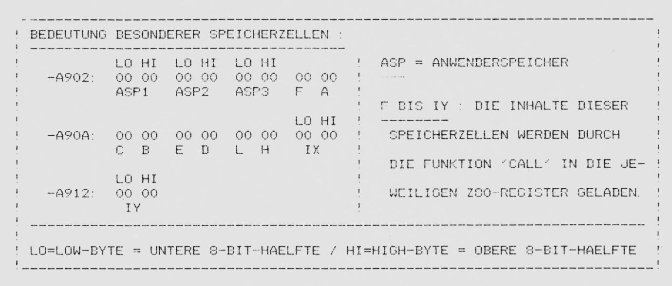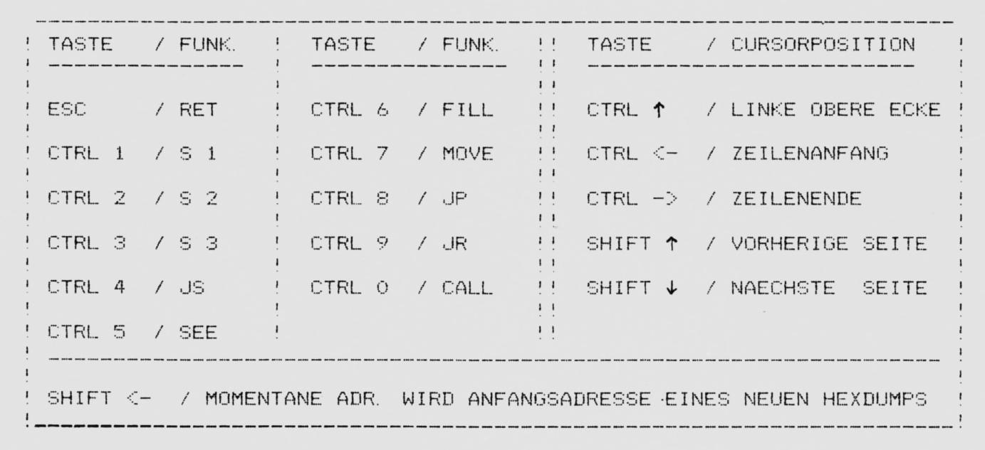 Wer mit dem Schneider CPC 464 Speicherbereiche unabhängig von BASIC analysieren oder auf unterster Ebene, also direkt in Z80-Maschinencode, programmieren wollte, der hatte bislang so seine Schwierigkeiten. Aber das hat sich nun geändert, denn mit dem Micro-Monitor steht Ihnen jetzt ein schnelles und handliches Hilfsmittel zur Verfügung, mit dem der Inhalt eines Speicherausschnittes in hexadezimaler Darstellung und als ASCII-Zeichen klar zu überschauen ist und mit dem die Hexcodes, mit Hilfe vielfältiger Cursorsteuerungsmöglichkeiten, direkt in die Speicherzellen eingegeben werden können. Wo zur Analyse eine ASCII-Darstellung nützlich ist, ist bei der Maschinencode-Programmierung eine Zeilen-Prüfsumme sehr hilfreich, da sich so beim Abtippen von Listings eventuelle Fehleingaben sehr schnell finden lassen. Der Micro-Monitor bietet beide Betriebsarten und vereinigt somit eigentlich zwei Programme in einem. Neben der bloßen Ein- und Ausgabe von Hexcodes gibt es aber noch andere Funktionen, wie z. B. Verschieben eines Speicherbereichs, Füllen eines Speicherbereichs mit einem bestimmten Wert, Aufruf von Maschinencode-Programmen, Drucker-Ausgabe usw. All diese Funktionen sind, nach Eingabe der nötigen Adressen bzw. Werte, in die dafür vorgesehenen Speicherzellen, über einen Tastendruck ausführbar. Bild 1 > Funktionsbeschreibung 1. Auswahl einer Anfangsadresse für einen Hexdump: Zuerst einmal muß die Anfangsadresse, also die Adresse, die beim Hexdump links oben angezeigt werden soll, in einen sogenannten „Anwenderspeicher“ (ASP1, ASP2, ASP3) eingegeben werden. 1.1 Direktes Eingeben in einen ASP: Nach dem Start von BASIC aus bzw. nach „JS“ oder „SEE“ (siehe unten) werden die Speicherzellen angezeigt, aus denen die funktionsführenden Routinen ihre Parameter beziehen. Die Adresse (16 Bit) oder der Wert (8 Bit) wird nun, wie in irgendeine andere Speicherzelle hexadezimal (LOW-Byte zuerst) eingegeben (vgl. Bild 1). 1.2 Indirektes Eingeben in einen ASP: („S1 “, „S2 “, „S2 “) Mit Hilfe der Funktionen „S1 “, „S2“ und „S3“ (vgl. Bild 2) wird dem jeweiligen ASP die „momentane Adresse“ zugewiesen, also die Adresse der Speicherzelle, auf deren Inhalt gerade der Cursor zeigt. Diese Art der Eingabe ist besonders für das Begrenzen eines Speicherbereiches (Blockanfang und -ende bei den Funktionen „FILL“ und „MOVE “) wichtig. Nachdem sich nun die Anfangsadresse in einem ASP befindet, wird der Cursor auf das LOW-Byte der Anfangsadresse gesetzt (Cursor-Steuerung siehe unten) und Funktion „JP“ ausgeführt. Bild 2 > 2. Erzeugen eines Hexdumps, der die ASP's zeigt: 2.1 Ohne Rekonstruktion des momentanen Hexdumps: („JS “) Die Funktion „JS“ erzeugt einen Hexdump mit der Anfangsadresse A902H und entspricht dem von Bild 1. 2.2 Mit Rekonstruktion des momentanen Hexdumps: („SEE “) Die Funktion „SEE“ arbeitet genau wie „JS “, aber wird dann später die Funktion „RET“ ausgeführt, gelangt man zurück in den Hexdump, von dem aus man „SEE“ ausgeführt hat. 3. Füllen eines Speicherbereiches mit einem bestimmten Wert: („FILL “) 3.1 Begrenzen eines Speicherbereiches: Zum Begrenzen eines Speicherbereiches, auch Block genannt, muß die Blockanfangsadresse in ASP1 und die Blockendadresse in ASP2 eingegeben werden (siehe 1.1 und 1.2). 3.2 Eingabe des Füll-Wertes: Der Füll-Wert (8 Bit) wird direkt (siehe 1.1) in das LOW-Byte von ASP3 eingegeben. Diese Funktion eignet sich vor allem zum Löschen eines Blocks (Füll-Wert = 00). 4. Verschieben eines Speicherbereiches: („MOVE “) Zum Verschieben, oder besser Kopieren muß zuerst der Block begrenzt (siehe 3.1) und dann die Zieladresse, also die Adresse, bei der der Block nach dem Verschieben beginnen soll, in ASP3 eingegeben werden (siehe 1.1 und 1.2). 5. Simulation eines absoluten Sprungs: („JP “) Faßt man den Inhalt der Speicherzelle, auf die der Cursor zeigt, als die untere 8-Bit-Hälfte und den Inhalt rechts daneben als die obere 8-Bit-Hälfte einer Adresse (16 Bit) auf, so erhält man eine Anfangsadresse für ein neues Hexdump. Diese Funktion ist vergleichbar mit der Ausführung des Z80- Befehls JP NN. 6. Simulation eines relativen Sprungs: („JR “) Diese Funktion arbeitet ähnlich wie „JP “, doch wird hier der Inhalt der Speicherzelle, auf die der Cursor zeigt, als Relativadresse interpretiert, so ergibt sich durch Addition (Inhalt < 128) bzw. Subtraktion (Inhalt > 127) des Inhalts von der momentanen Adresse eine Anfangsadresse für einen neuen Hexdump. („JR“ ist vergleichbar mit dem Z80- Befehl JR E.) 7. Aufruf eines Maschinen-code-Programms: („CALL “) Die Anfangsadresse des Maschinen-code-Programms muß zuerst in ASP3 eingegeben werden (siehe 1.1 und 1.2), dann sind die entsprechenden Werte für die Z80-Register direkt in die Speicherzellen A908H bis A913H (vgl. Bild 1) einzugeben (siehe 1.1). Diese Eingaben sind für solche Programme gedacht, die, um sinnvoll zu funktionieren, bestimmte Werte in bestimmten Registern benötigen. Dies ist der Fall bei dem Programm zur Ausgabe eines Zeichens auf dem Bildschirm (Anfangsadresse:' BB5AH; Vorsicht bei der Eingabe: LOW-Byte zuerst!). Hierbei muß sich der ASCII-Code des Zeichens im Register A befinden. Sind nun Adresse und Zeichencode richtig eingegeben, so wird die Funktion „CALL“ durch die Tastenkombination CTRL und 0 (siehe Bild 2) ausgeführt, wobei der Bildschirm gelöscht wird. Wurde alles richtig gemacht, so müßte sich das Zeichen jetzt in der linken oberen Ecke des Bildschirms befinden, und zwar so lange, bis eine Taste gedrückt wird, erst dann erscheint wieder der Hexdump. 8. Rückkehr ins BASIC: („RET “) 9. Ausdruck eines Speicherbereiches: Zum Ausdrucken des Speicherbereiches muß dieser erst einmal begrenzt werden (siehe 3.1). Dann wird die Anfangsadresse des Ausdruck-Programms (A4F3H; Vorsicht: LOW-Byte zuerst!) in ASP3 eingegeben (siehe 1.1). Nachdem der Drucker betriebsbereit gemacht wo