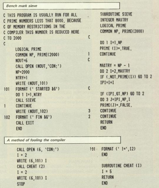 FEW would disagree that the least expensive product in a range is not necessarily the best value for money. Nevada Fortran, from Ellis Computing, USA, is by far the cheapest Fortran compiler on the market at just £39, with its nearest rival for CP/M machines easily topping the £200 mark. With that sort of price differential it is hard to avoid saying that whatever the shortcomings of the product penniless programmers who need Fortran on a micro could do no better for their money. Of course everything depends on requirements, and Nevada Fortran certainly has its deficiencies. Perhaps the worst of these is that it is slow -not only compared to its mainframe equivalents, but also to other micro-based compiled languages such as Turbo Pascal, see the bench mark timings in Figure I. However many potential users are likely to need it less for autonomous software development than for editing and testing modules downloaded from a mini or mainframe, or written and debugged on a PCW or CPC6128, then uploaded. Given the frustrating response time of many multi-user systems an objectively slow compilation and program execution under CP/M might well seem to some like an express train, quite apart from what a micro can offer in reducing the nervous strain caused by screen messages warning that allocated CPU time will imminently be exceeded. It has to be said, however, that as a stand-alone language Nevada Fortran is somewhat restricted. It has no Link facility, so unlike some of its micro-based competitors such as MS-Fortran and Pro-Fortran, it does not come with a library of subroutines on disc, and all modules have to be compiled in one go. It also produces threaded code -that is, it creates a CP/M executable file - with a .COM extension, by first loading a set of routines ready to be called from the assembled Object file.