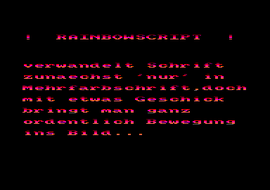 Farbige Zeiten Bunte Texte in Regenbogenfarben Rainbowscript ist ein Programm zum Verschönern von Texten, wie zum Beispiel einer Anleitung oder eines Vorspanns. Dabei wird aus einer normalen Schrift eine 'Regenbogenschriff gemacht, die durch Farbwechsel auch animiert werden kann. Das Programm arbeitet nach einer einfachen Methode und ist daher auch relativ kurz: Der gesamte Bildschirm wird (pixel-) zeilenweise nach gesetzten Punkten durchsucht. Alle gesetzten Punkte innerhalb einer Zeile werden mit derselben Farbe versehen. Anschließend wird die nächste Zeile durchsucht und alle gesetzten Punkte mit der nächsten Farbe versehen. In MODE 0 werden dabei immer wieder die Farben 8-1 durchlaufen, in MODE 1 die Farben 3-1. Das Programm ist sowohl für MODE 0 als auch für MODE 1 ausgelegt und paßt die Anzahl der Farben automatisch an. ln MODE 1 dauert die Umfärbung allerdings etwas länger, da die Auflösung und damit auch die Anzahl der zu überprüfenden Punkte höher ist. Tja. werden Sie sagen, das ist ja alles schön und gut. aber wie sieht es aus, wenn auch noch Grafik auf dem Bildschirm ist? Und genau das ist der springende Punkt. Die Grafik würde natürlich auch streifenartig eingefärbt (sieht übrigens manchmal ganz hübsch aus). Hierfür gibt es einige Lösungsmöglichkeiten. Entweder Sie bringen erst den Text auf den Bildschirm, rufen dann die Assemblerroutine auf und zeichnen anschließend die Grafik auf den Bildschirm, oder Sie lassen die Grafik ganz weg. Eine dritte Möglichkeit wäre, das Maschinenprogramm so umzuschreiben, daß nur ein Teil des Bildschirms neu eingefärbt wird. Doch darauf jetzt näher einzugehen, würde den Rahmen des Beitrags sprengen. Da das Programm nach einer einfachen, aber schwierig durchzuführenden Methode arbeitet, ist die Umfärbung nicht gerade als rasant zu bezeichnen (dafür ist das Programm kurz). Diese Zeit läßt sich jedoch mit interessanten Einblend-Effekten überbrücken. Solche und auch andere Anwendungsbeispiele werden im Demonsirationsprogramm vorgeführt, das allerdings nur einige der vielfältigen Möglichkeiten von RAINBOWSCRIPT aufzeigen kann. Zum Abtippen: Zunächst müssen Sie das Programm RAINBOWSCRIPT abtippen und speichern. Anschließend starten Sie es, und wenn Sie alles richtig abgetippt haben, dann müßte das Programm RAINBOW.MC erzeugt beziehungsweise abgespeichert werden. Danach sollten Sie noch das Demonstrationsprogramm abtippen und speichern. Sie werden erstaunt sein, was für Effekte ein so kurzes Programm in Verbindung mit RAINBOWSCRIPT zustande bringt. (Das Programm stoppt an zwei Stellen - zum Fortfahren drücken Sic bitte jeweils die ENTER-Taste.) Wenn Sie RAINBOWSCRIPT in eigenen Programmen verwenden wollen, gehen Sie bitte wie folgt vor: Zunächst müssen Sie den Speicher mit MEMORY &9FFFschützen. Anschließend laden Sie das Programm mitLOAD"RAINBOW.MC",&A007.Das Programm kann jetzt jederzeit mit CALL &A007 aufgerufen werden, wobei die Farbwahl entscheidend zur Lesbarkeit beiträgt. Die Speicherstellen &A000-&A007 werden zur Verwaltung von Daten benötigt. Es ist übrigens nicht ratsam, das Programm aus MODE 2 aufzurufen, denn eine Regenbogenschrift aus einer Farbe (?!) sieht etwas ... am besten Sie schauen es selbst an.