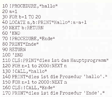 Unterprogramme kommen wohl in allen BASIC- Programmen vor, zudem meisten noch in artenreicher Vielfalt. Dem Programmierer bleibt bei solchen Programmen eigentlich nur eins übrig, er muß sich alle Zeilennummern, in denen ein solches Unterprogramm beginnt, merken oder aufschreiben, falls die Routine mehrmals angesprungen werden soll. Wie oft sieht man da neidisch zu seinen Kollegen von der PASCAL- Programmierung, wenn diese ihre Prozeduren einfach mit dem Namen aufm len. Um den Unterprogramm-Freaks unter Ihnen etwas unter die Arme zu greifen, wurde dieses Hilfsprogramm zum Benennen von Unterroutinen geschrieben. Es ermöglicht Ihnen Unterprogramme, ähnlich wie in PASCAL, mit einem Namen zu versehen und innerhalb des BASIC-Programmes mit diesem Namen aufzurufen. Die Programmbeschreibung Mit dem Befehl |PROCEDUR , " < name > " definieren Sie eine Prozedur, also ein Unterprogramm, mit dem Namen < name >. Hierbei wird zwischen Groß- und Kleinschreibung unterschieden. Nach dem PROCEDUR- Befehl programmieren Sie normal Ihr Unterprogramm und beenden dieses mit RETURN. Als nächstes geben Sie eine Zeile mit einem Hochkomma ' und dem Befehlswon END in Großschrift ein, die die Routine abschließt. Aufgerufen wird diese Routine mit |CALL,"< name > " , wobei Sie bitte auf Groß- und Kleinschreibung achten. Der letzte neue Befehl heißt |CLEAR Er löscht sämtliche Prozedurdefinitionen, jedoch nicht die Prozeduren selbst. Ein Beispiel Damit Sie etwas Übung mit den neuen Befehlen bekommen, hier nun ein Beispiel. Das Ausrufezeichen steht wieder für den RSX-Strich: