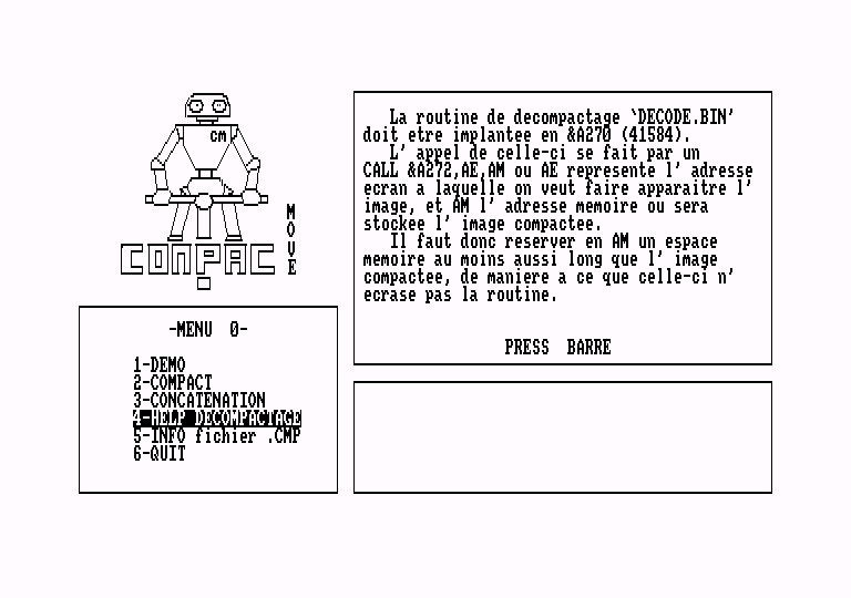 Simple d'utilisation vous découvrirez vite les multiples facettes de ce logiciel qui vous permettra les effets les plus intéressants et les plus saisissants: animation d'images, compactage, restitutions variées, etc...Compacmove est un utilitaire graphique indispensable pour constituer des bibliothèques d'images riches et variées, ou créer des jeux d'aventure et d'arcade. Compacmove compacte n'importe quelles images dans n'importe quels formats, avec un gain de place allant jusqu'à 80 %. Il offre l'avantage de travailler en mode 0 et 1 et de restituer vos œuvres de trois manières différentes : - progression vers le haut,