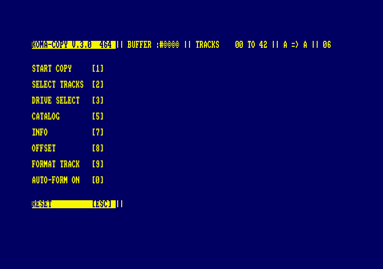 The Ultimate Disccopy-Machine! Dieses Programm verdient zurecht den Namen, das ultimative Kopierprogramm. Mit Koma-Copy lassen sich Sicherheitskopien von jeder Diskette erstellen. Selbst die meisten Programme die sich auf dem Markt befinden, lassen sich kopieren, natürlich nur für den eigenen Bedarf. Die Optionen sind so umfangreich, daß sie einer langen Bedienungsanleitung bedürfen. Nach dem Start meldet sich KOMA-COPY mit dem Hauptmenue. In der ersten Zeile des Bildschirms befindet sich die sogenannte »STATUS-ZEILE«. Sie gibt ständig Auskunft über eingestellte Werte. Ganz links finden Sie den Namen des Programms, die Versionsnummer, sowie den Modus. Steht hier eine 6128, können Sie auf den gesamten Arbeitsspeicher des CPC-6128 zurückgreifen, d.h. es werden bis zu 21 normal formatierte Tracks in einem Durchgang kopiert. Im 464-Modus sind es maximal 8! Der 464-er Modus ist übrigens gleichermaßen für 464 und 664 geeignet. Dieser Bereich der Status-Zeile wird während des Kopierens auch zur Ausgabe der DISKETTENWECHSEL-Meldung benutzt. Als nächstes finden Sie die Angabe des Buffers. Nach dem Start steht hier nichts, da der Arbeitsspeicher noch leer ist. Während des Kopiervorgangs wird der belegte Speicherplatz angezeigt. Sollten Sie sich in der Wahl des OFFSETS (mehr dazu später) verschätzt haben, kann man nach einem eventuellen Absturz des Programms meist schon am zu hoch liegenden Buffer erkennen, wo die Ursache liegt. Die folgende Anzeige gibt die eingestellten Spuren an. Nach dem Start steht hier 00 bis 42, d.h. das Programm beginnt mit Spur 0 und hört nach Spur 42 auf. Diese Werte können selbstverständlich verändert werden! Alle Funktionen des Programms, die einzelne Spuren bearbeiten, greifen auf die an erster Stelle angezeigte Spur zurück. Die folgende Anzeige gibt die eingestellte Kopierrichtung an. Möglich sind A= >A,A= >B,B= >B oder B=>A. An letzter Stelle wird der gewählte Offset angegeben. Das Programm befindet sich am Ende des Arbeitsspeichers und ist nicht gegen Überschreiben geschützt. Die zu kopierenden Sektoren werden, beginnend mit dem Start des Arbeitsspeichers, kontinuierlich aneinandergereiht. Falls man versucht, zuviele Sektoren zu laden, werden irgendwann SÄtoren an der Stelle abgelegt, an der das Kopierprogramm steht, was unweigerlich zu einem Absturz führt. Man könnte meinen, daß es doch eigentlich möglich sein sollte, eine Abfrage der Speicherobergrenze einzubauen. Natürlich wäre dies möglich! Es hätte aber unweigerlich eine Verkleinerung des verfügbaren Arbeitsspeichers zur Folge. Da ich auf möglichst wenige Diskettenwechsel Wert lege, habe ich deshalb die Offset-Rege-lung eingeführt. Der Offset gibt an, wieviele Spuren in einem Durchgang kopiert werden sollen. Wenn Sie nur eine normal formatierte Diskette kopieren wollen, können Sie im 464-Modus einen Offset von 8 wählen, d.h. Sie kopieren eine komplette Diskette mit 5 Disketten wechseln. Bei geschützten Disketten hat sich gezeigt, daß man mit einem Offset von 6 eigentlich keine Probleme hat. Es hängt aber immer von der Art des Schutzes a, welchen Offset man wählen muß. Probieren Sie es aus, die Wahl eines geeigneten Offsets spart Zeit! Belegung der Funktionstasten TASTE 1: Start des Kopiervorgangs. Es werden die in der StatusZeile angezeigten Spuren in der angewählten Richtung mit dem angezeigten Offset kopiert. TASTE 2: Auswahl der Spuren, die kopiert werden sollen. Geben Sie zuerst die Startspur, dann die Endspur ein. Sie sollten vermeiden als letzte Spur einen Wert einzugeben, der Ihrem Laufwerk den Kopf abdreht, z.B. 80. Angebracht sind 00 bis 43. Es müssen immer zwei Zahlen eingegeben werden, z.B. Spur 7 bis 9 muß als 07 bis 09 angegeben werden. Ein Beispiel für die Benutzung der Spuranwahl: Sie wissen z.B., daß Ihre Disketten CP/M-formatiert sind. Da bei diesem Format die Spuren 00 und 01 das System enthalten, brauchen Sie sie nicht zu kopieren. Sie wählen deshalb nur Spur 02 bis 39 und sparen Zeit. Andersherum können Sie das Programm auch benutzen, um nur die CP/M-Systemspuren auf eine andere Diskette zu übertragen. So komfortabel wie SYSGEN.- oder BOOTGEN.COM ist KOMA-COPY allemal. Ein letztes Beispiel: Manchmal unterläuft dem Benutzer ein Fehler, man legt eine falsche Zieldiskette ein oder ähnliches. Bisher mußte abgebrochen und ganz von vorne angefangen werden. Mit KOMACOPY machen Sie an der Stelle weiter, an der der Fehler auftrat. TASTE 3: Auswahl der Kopierrichtung. Sie geben zuerst das Quell-Laufwerk, dann das Ziellaufwerk an. Die Richtung wird in der Statuszeile vermerkt. Wenn Quell- und Ziellaufwerk gleich sind, wird nach dem Lade- und Abspeichervorgang in der linken oberen Bildschirmecke die Diskettenwechselmeldung ausgegeben, ansonsten wird ohne Pause überspielt. Eine Anmerkung: Sobald die Diskettenwechselmeldung erscheint, kann durch Drücken von ESC der Kopiervorgang unterbrochen und zum Hauptmenue verzweigt werden. TASTE 4: (Nicht im Hauptmenue aufgeführt!!) dient zum Umschalten vom 6128- in den 464-Modus, Das Programm startet nach dem Aufruf im 464-Modus, durch Veränderung eines Bytes im Basic-Lader kann ein Durchstarten in den 6128-Modus erreicht werden. TASTE 5: Wie oft kommt es vor, daß man sich zwei Disket-zum Kopieren bereitgelegt hat und nachdem man das Kopierprogramm gestartet hat, nicht mehr weiß welches Programm sich auf welcher Diskette befindet. Taste 5 schafft Abhilfe und führt auf dem angewählten Quellaufwerk einen CATALOG durch. Nach Beendigung. Taste betätigen! TASTE 6 : (Nicht im Hauptmenue aufgeführt!!) Wenn Sie Taste 6 zum Umschalten in den 6128-Modus drücken, wird abgefragt ob in den N(ormal)- oder S(uper)-Mode geschaltet werden soll. Der Normal-Modus, erkennbar an einem N hin-ler der 6128 in der Statuszeile, ist ausschließlich zum Kopieren von Disketten, auf denen sich Sektoren mit gleicher Größe befinden, geeignet (z.B. normal formatierte Disketten)!!! In diesem Mode kann eine Diskette in nur zwei Dur