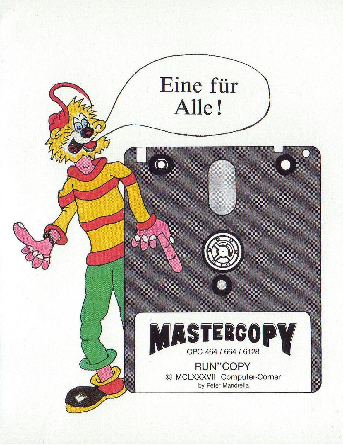 Das Programm »MASTERCOPY« ist ein Kopierprogramm, lauffähig auf Schneider-Heimcomputer CPC 464/664/6128. »MASTERCOPY« ist komplett menuegesteuert und enthält eine genaue Dokumentation der Kopiermöglichkeiten und Funktionen innerhalb des Programmes. Es kopiert alle auf dem Markt erhältlichen Programme, Stand 03/87, die softwaremäßig geschützt sind. Sollten Sie dennoch auf ein Programm stoßen, welches sich nicht kopieren läßt, schicken Sie das nicht kopierbare Programm und Ihre MASTERCOPY-Diskette mit der beiliegenden Registrierungskarte an uns zurück. Gegen eine Kostenbeteiligung von 10,- DM (Porto und Verpackung) erhalten Sie von uns die aktuellste Version von »MASTERCOPY«, die auch den neuesten softwaremäßigen Kopierschutz umgeht.