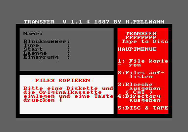 Transfer ist ein leistungsfähiges Programm zum Kopieren von Kassetten auf Diskette und von Diskette auf Kassette. Es ist menügesteuert und deshalb einfach zu bedienen! Transfer läßt bei binären Daten eine Verschiebung des Programmstartes sowie die Änderung der Einsprungadresse zu. Da heutzutage der Kopierschutz etwas anders ausschaut, handelt es sich bei „Transfer” also nicht um ein Raubkopierprogramm. Trotzdem soll darauf hingewiesen werden, daß das Urheberrecht auf jeden Fall beachtet werden muß. Allgemeines zum Programm: Transfer arbeitet mit Amsdos-Vektoren und unterdrückt die Fehlermeldungen des Amsdos nicht! Natürlich reagiert Transfer auf diese Fehler und bricht nicht ab (wie etwa Basic), da alle Amsdos-Zugriffe über Maschinencode erfolgen. Das Programm meldet sich mit dem Menü Tape to Dis. Punkt 1 ist der wohl interessanteste, nämlich das Kopieren von Kassette auf Diskette. Das Programm fordert Sie zum Einlegen der Originalkassette, einer Diskette und zum Druck einer Taste auf. Sobald Transfer den 1. Block einer Datei gefunden hat, müssen Sie den Diskettennamen eingeben. Dieser Name wird vom Amsdos verarbeitet, er darf also auch die gewünschte Usernummer oder das gewünschte Laufwerk enthalten. Möchten Sie aber die Datei nicht kopieren, drücken Sie einfach die Enter-Taste. Bei eventuellen Leserfehlern während des Kopierens bricht das Programm den Kopiervorgang einfach ab und sucht das nächste File. Diese Routine wird wie alle Programmteile mit zweimaligem Druck auf die ESC-Taste beendet (beim zweiten Druck solange gedrückt halten, bis das Programm darauf reagiert!). Der 2. Menüpunkt erstellt von einer eingelegten Kassette ein Inhaltsverzeichnis besonderer Art. Transfer informiert nicht nur über Art und Länge der Files, sondern auch darüber, ob diese vollständig auf Kassette sind. Fehlen einige Blöcke oder sind diese unleserlich, so warnt das Programm Sie und gibt die Nummern der fehlenden Blöcke an. Dieser Kassettenkatalog, der ebenfalls mit ESC abgebrochen wird, kann auch auf einem Drucker ausgegeben werden. Findet Transfer beim Aufruf dieses Menüpunktes einen Drucker vor (ON LINE Stellung!), so kann man zwischen Bildschirm und Drucker wählen. Unter dem Menüpunkt „Blöcke ausgeben” verbirgt sich eine dem Basic befehl CAT ähnliche Funktion, nämlich das einfache Überprüfen einzelner Blöcke auf Lesbarkeit und Namen. Diese Funktion eignet sich zum Suchen bestimmter Programme. Mit ESC bricht man auch diese Routine ab. Punkt 4 des ersten Menüs gibt die Directory einer Diskette aus und bedarf keiner weiteren Erläuterung. Findet Transfer einen Drucker vor (ON LINE Stellung!), wird die Directory auch auf dem Drukker ausgegeben. Punkt 5 des Menüs sorgt für den Aufbau des 2. Menüs Disc to Tape. Auch hier steht das Kopieren eines Files an erster Stelle. Zuerst wählen Sie den Namen, den diese Datei auf Kassette haben soll. Geben Sie hier nur ENTER ein, so wird es ein Unnamed File, geben Sie ein * ein, so wird der Diskettenname übernommen. Als nächstes können Sie die Baudrate zwischen 700 und 3600 Baud frei auswählen. An dieser Stelle möchte ich darauf hinweisen, daß der Recorder des CPC 464 nicht für Cr02 Kassetten ausgelegt ist und Sie diese auf keinen Fall bei höheren Baudraten verwenden sollten (bei 3600 Baud können Sie nämlich sonst von Glück reden, wenn der Computer den Namen Ihrer Datei noch erkennt!). Ihre Eingabe wird zur nächstmöglichen Baudrate gerundet. Das Kopieren von Diskette auf Kassette eignet sich vorzüglich zum Erstellen von Sicherheitskopien teurer Anwendungssoftware. Sollte dem Original etwas zustoßen, können Sie die Kopie wieder auf Diskette zurückkopieren. Punkt 2 des zweiten Menüs entspricht Punkt 4 des ersten Menüs und Punkt 3 geht zurück ins erste Menü. Noch ein Hinweis zum Kopieren von Binärfiles: Transfer fragt Sie nach einer neuen Startadresse sowie einer neuen Einsprungadresse. Das ist notwendig, weil einige Kassettenprogramme das Dis-ketten-RAM belegen. Wollen Sie die Adressen nicht verändern, drücken Sie nur ENTER. Beim Kopieren von geschützten Basicprogrammen (SAVE” “,P) wird der Schutz beim Kopieren nicht mitkopiert!! Das ist ganz nützlich, da Kassettenprogramme zum Nachladen oft keinen Namen angeben und Sie solche Programme erst ändern müssen. Wird dieses Programm auf dem CPC 664 oder CPC 6128 eingesetzt und wird Ihr Recorder nicht vom Computer gesteuert, so muß beim Lesen von Kassette nach jedem Block kurz das Band gestoppt werden! Viel Spaß beim Ausprobieren!