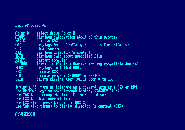 - extensible command system : instead of typing a filename to launch, you can also specify a Resident System eXtension (RSX) ! By example, to launch HxC Floppy Emulator Manager, instead of getting back to BASIC and type |HXC, you just have to enter HXC as any other command. Parameters are also supported, so by example you can use default REN command or Arnor UTOPIA's COPY commands !