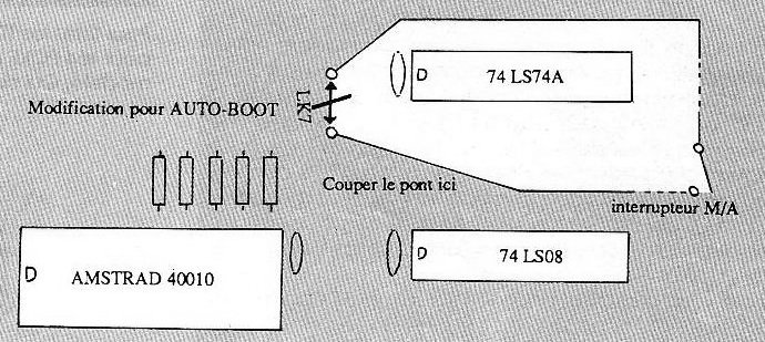 Avec la bidouille que je vous propose, cette procédure pourra être réduite au strict minimum, c'est à dire, dans la plupart des cas à introduire la disquette et à allumer l'ordinateur, ou appuyer sur la touche RESET (pour ceux qui en ont ajouté une, voir CPC N°35) ou bien enfoncer les touches CTRL+SHIFT+ESC ou encore effectuer un CALL 0 pour que le programme se charge et s'éxécute. Malheureusement, dans certains cas. Il faudra quand même au moins taper |CPM, et pour certains logiciels du commerce, l'astuce ne sera pas utilisable du tout. Pour ceux qui sont prêts à modifier leur cher Amstrad et qui accepteront de dépenser une somme de quelques francs, le programme rendra ses services maximums. Mais, sachez que même sans la bidouille "hard", le programme peut vous faciliter la vie. FONCTIONNEMENT Le programme BASIC se charge d'installer sur le secteur Boot des disquettes (donc uniquement sur les disquettes système ou vendor) un petit programme en langage machine qui modifiera les couleurs, affichera un message, modifiera les paramètres du lecteur de disquettes (pour modifier sa vitesse d'accès, et/ou l'utiliser en 80 pistes), affichera le catalogue, et pourra lancer automatiquement un programme BASIC ou binaire ou vous rendre la main sous interpréteur BASIC. (Faites une copie de sauvegarde avant essai si vous n'êtes pas sûr de vous). Les programmeurs les plus chevronnés pourront récupérer les quelques 8K perdus sur les pistes 0 et 1 pour y loger un utilitaire ou un programme personnel (menu ou catalogue amélioré, ... ), qui se chargerait et s'exécuterait automatiquement (utiliser alors le vecteur BD13). MODIFICATION DE LA CARTE DU 6128 Matériel : un interrupteur M/A et 2 fils en tout et pour tout. Outils : un tournevis, un cutter, un fer à souder et de la soudure. Cette modification, qui est vraiment à la portée de quiconque a déjà manié un fer à souder, permettra de choisir par un simple Interrupteur, d'arriver sous BASIC à l'allumage ou réinitialisation de la machine (comme c'est le cas normalement) ou d'exécuter automatiquement la commande |CPM. Par conséquent, cette bidouille peut être réalisée sans utilisation obligatoire du programme précédent pour ceux qui désireraient lancer automatiquement des logiciels tels que Turbo Pascal ou des jeux qui se démarrent par cette commande. Mais attention, cela ne fonctionnera pas pour tous les jeux. En effet, en inversant l'Interrupteur, un effet sous-jacent au lancement de CPM se produit : les adresses de sélection des ROMs BASIC (00) et Amsdos (07) se trouvent inversées. Par conséquent, tous les programmes qui réfèrent directement les adresses de sélection standards (au lieu d'utiliser les vecteurs système) plantent. Moralité : seuls les logiciels “bien faits" fonctionneront correctement avec l'interrupteur sur la position CPM. A vous de tester... L'utilisation conjointe du programme et de la modification apporte la possibilité de lancer un programme BASIC par exemple, sans rien taper au clavier. Formidable, non ? INSTALLATION DE L'INTERRUPTEUR Après avoir 'soulevé le capot" de l'Amstrad avec le tournevis (attention, perte de garantie à cet Instant), repérer le pont marqué LK7 sur la carte. Il est actuellement fermé par une piste reliant deux points, cachée sous une couche de peinture en forme de flèche. Il faut couper, en grattant soigneusement à l'aide du cutter, cette piste. Souder ensuite un fil sur chaque extrémité du pont ; comme ces extrémités sont percées, un fil rigide sera enfoncé dans le trou. SI vous utilisez un fil souple à plusieurs brins, enfoncez de 1 à 2 mm et soudez des tiges métalliques (des extrémités de résistances ou autres composants feront très bien l'affaire). Couper ces tiges à 1 cm environ, pour y greffer ensuite les deux fils qui seront reliés à l'interrupteur. Percer le plastique du clavier pour y placer l'Interrupteur : par exemple en bas à droite du pavé numérique, le long du lecteur 3 pouces. Repérer les deux positions de l'interrupteur. Refermer le clavier. Dans la position fermée, l'utilisation de l'Amstrad sera classique (démarrage du BASIC), Dans la position ouvert, on chargera à l'Initialisation le CPM sur disquette. Bien sûr, le retour au BASIC peut se faire si la disquette comprend un secteur Boot écrit par le programme qui accompagne cet article, avec l'avantage d'avoir des couleurs altérées (plutôt que jaune sur bleu du standard), un lecteur de disquettes reconfiguré (très appréciable sur JASMIN 80 pistes), et un catalogue immédiatement présent à l'écran. REMARQUES ET SUGGESTIONS Ne disposant pas de 664, je n'ai pas pu tester une version pour cet appareil, mais la modification hard sera sans doute Identique et le programme ne devrait nécessiter que quelques modifications. L'idéal serait de réaliser une version compatible avec les deux appareils. Il est bien sûr également possible d'ajouter d'autres Idées au programme. Référez-vous pour cela au listing assembleur pour des explications sur la démarche utilisée. Alors, à vos claviers...