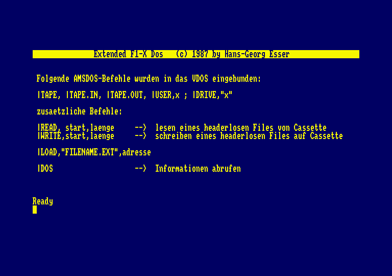 Wollen Sie beim Anschluß eines Vortex-Controllers lieber mit den AMSDOS-Befehlen arbeiten? Wenn ja, dann ist dieses Programm das richtige für Sie. Die Erweiterung der Befehle sieht wie folgt aus: |Tape |Tape.in |Tape. out |Drive, »A« (bzw. |Drive,"B"‘) |User, xDiese Befehle machen die Geräte-Konfiguration CPC + 3“ -Erstlaufwerk + Vortex F1-X wieder AMSDOS-Kompatibel. So brauchen alte Programme nicht angepaßt werden, wenn diese Routine vorher gestartet wurde.Es kann auf die aufgeführten Vortex-Befehle verzichtet werden, ohne darauf verzichten zu müssen. Das heißt. Sie können wählen zwischen Vortex und AMSDOS-Befehlen. Die Befehle sind: CAS - CAS. IN - CAS. OUT - SELECT.Aber das ist noch nicht alles, es wurden noch andere Befehle implementiert.|READ, Anfang, Länge: liest headerloses File von Cassette |WRITE, Anfang, Länge: schreibt headerloses File auf Cassette. Z.B. kann mit folgendem Befehl der Bildschirm headerlos abgesaved werden: |WRITE, &C000, &4000 und wieder laden mit |READ, &C000, &4000 und dann gibt es noch den Befehl |Load, »FILENAME«, adr mit dem Binärfiles an jede Speicheradresse geladen werden können (z.B. unter HIMEM) oder an Adressen, an die man mit dem normalen LOAD- Befehl nicht gelangt, z.B. dez 40. Sollten Sie die Übersicht verloren haben, so können Sie alle Befehle mit dem kurzen Kommando |DOS auflisten und erklären lassen. Anzumerken wäre noch, daß der neue USER- Befehl komfortabler ist als der alte, es lassen sich statt USER 0-15 nun USER 0 — 255 verwenden. Sie können auch, was nicht zu verachten ist, z.B. mit |USER, 229 auf mit |ERA, gelöschte Files zugreifen. Alle |TAPE-Kommandos greifen auf das AMSDOS-Floppy-Controller System zu. Das heißt, der Zugriff erfolgt auf die Epprom-Nummer 7. Darum alle Bastler: Wenn Sie die Nummer Ihres AMSDOS-Epproms verändert haben, funktionieren die Befehle nicht. Auch laufen die Befehle nicht mit anderen RSX-Befehlen zusammen, da bei mehreren Erweiterungen mehrmals die RSX-Routine #BCD1 aufgerufen wird. Das macht Ihr Computer nicht mit. Alle alten RSX-Befehle einschließlich VDOS-, bzw. AMSDOS-Befehle verschwinden bei einem doppelten Aufruf. Das liegt aber nicht an der Erweiterung, sondern an der Routine, die die Befehle in das Betriebssystem einbindet. Tippen Sie folgendes ab: 1. Lader für das Binär-File 1000 SYMBOL AFTER 256 1010 MEMORY &9FFF 1020 LOAD "dos. bin",&a000 1030 CALL &A000 1040 |DOSund speichern Sie es ab. Danach müssen Sie die DATA-Zeilen 1000 - 1040 abtippen und starten und wenn alles geklappt hat wird das ganze als Binär-File abgesaved.(H.-G. Esser/CD) , CPCAI