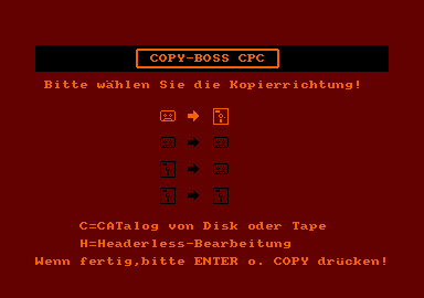 Um mit dem Programm zu arbeiten, sind zunächst die beiden Listings (MC-Generator und Hauptprogramm) abzutippen, sofern Sie nicht die Diskette oder Cassette vom Leserservice haben. Wichtig ist dabei folgendes: CPC-464-User ohne Floppy lassen die Befehle |CAS, |DISC, |CAS.IN usw. ganz weg. Schneider-Floppy-Besitzer müssen bei allen |CAS-Anweisungen das CAS durch TAPE ersetzen. Nach Start des Programms erfolgt - falls noch nicht geschehen - das Nachladen des Maschinencodes. Dieser muß vorher mit dem MC-Generator erstellt und hinter bzw. auf der gleichen Disk mit "Copy-Boss" gespeichert werden. Dann können Sie imHauptmenü (s. Hardcopy) CAT von Disk oder Tape, Headerless oder die Kopierrichtung anwählen. In letzterem Fall sind nun die Namen des Originals und der Kopie einzugeben, so daß eine Umbenennung möglich ist. Diese Bezeichnungen werden ausführlich geprüft und dann zur Kontrolle so angezeigt, wie sie nun benutzt würden. Besonders komfortabel ist, daß Sieden Namen des Originals mit ENTER auch für die Kopie eingeben können. War alles zufriedenstellend, wird nun der Header des Originals eingelesen und übersichtlich angezeigt; mit ENTER wird der Rest des Originals gelesen und dann gleich abgespeichert. Ober SPACE (Leertaste) läßt sich der Header manipulieren: Man übernimmt mit ENTER die vorher eingetragene Zahl (bei-Start, Länge, Autostart) oder überschreibt durch Eingabe einer neuen Ziffer (im Dezimalsystem). Nur beim Typ sind Zahlen erforderlich (ENTER bewirkt Typ = 0 = Basic): 1 = geschütztes Basic; 2 = binär; 3 = gesch. binär; 22 = ASCII; jede andere Zahl zwischen 4 und 255 ergibt einen unbekannten Dateityp. Bei ASCII-Files ist eine spezielle Behandlung nötig, da sie als Länge Null haben. Wenn "ASCII!” erscheint, drük-ken Sie die RESET-Taste des Datacorders und folgen den Anweisungen. (Falls von Diskette kopiert wird, muß die Länge bekannt sein, da sie sich hier nicht so einfach ermitteln läßt.) Ist "Bitte zum zweiten ASCII-Block spulen” zu lesen, spulen Sie zu 000; dann wird auch das ASCII-File kopiert. Wollen Sie einen Headerless kopieren, sind Start, Länge, Sync.-Byte und SAVE-Name einzugeben. Erscheint "Dieser Headerless kann nicht gleich auf Disk kopiert werden”, so müssen Sie ihn erst auf Cassette ziehen und dann laden (weil er den Floppy-Bereich überschreibt). Normal gesicherte Programme, die den Floppy-Speicher ab 42619 überschreiben, werden geladen und dann mit einem Relocator gespeichert. Zur Anzeige kommt ”*** RELOCATING ***”, der Relocator wird generiert, und Sie können den Start-CALL des Programms eingeben. Ist er Ihnen nicht bekannt, geben Sie nur ENTER ein, was nach dem Relokatieren ein ”RET” zu Basic bzw. Maschinensprache bewirkt. Ist das Programm bis zu 16 KByte lang, wird es in den Bildschirmspeicher geladen. Dies hat sich als optimal erwiesen, da so fast alles normal relokatiert werden kann, was z.B. bei 'Transmat” nicht oder nur mit Zusatzprogramm klappt. (Theoretisch ist es auch möglich, daß "Break in 150” erscheint. Das bedeutet, daß das Programm größer als ca. 43 bis 44 KByte ist und daher-zumindest bei vortex - nicht direkt auf Disk gezogen werden kann. Dies war aber bei meinen Tests nie der Fall, weshalb ich auf ein Programm, das dies behebt, verzichtet habe.) Wurden Programm und Relocator korrekt gesaved, ' müssen Sie, um das Programm von Disk zu starten, seinen Lader (oft Basic) ändern. Dies geschieht, indem man nach Laden des relokatierten Programms bzw. vor dem Start-CALL folgendes eingibt (entsprechender Name einsetzen): "LOAD 'Name des relokatierten Files' mit ”.RLC” am Ende' CALL &AFE2". Nun steht das Programm so im Speicher, wie es sein soll. Jetzt fehlt nur noch der Start-CALL "CALL...” aus dem Lader. Das alles ist bei weitem nicht so kompliziert, wie es klingt, weil die meisten Programme den Floppy-Bereich nicht überschreiben und so mit ”Copy-Boss" einfach, schnell und komfortabel kopiert werden können. Wer trotzdem noch Probleme haben sollte, kann mir - bitte mit frankiertem Rückumschlag - schreiben. Wichtig ist noch, daß alle Zahleneingaben (Start usw.) dezimal erfolgen müssen, da hexadezimal eventuell von Basic falsch umgerechnet wird. Jan-Mirko Maczewski , CPC Magazin |