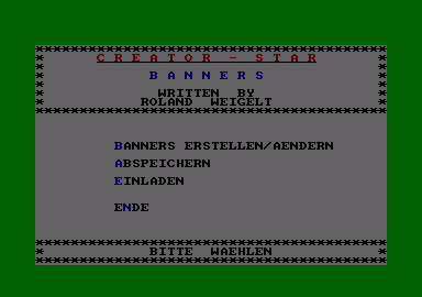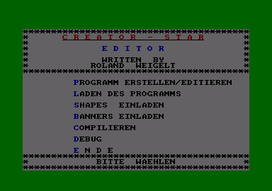 Der Creator Star ist ein Programm, mit dessen Hilfe Sic Titelbilder zu Ihren eigenen Programmen entwerfen können, die weit über das hinausgehen, was bisher mit einem einfachen Ladebild möglich war. Diese Titelbilder bestehen aus kurzen, animierten Trickfilmen, die vom Creator Star automatisch in Basicprogramme übersetzt und danach auf Diskette abgespeichert werden können. Diese Basicprogramme nehmen Sie dann nachher, und setzen sie anstelle eines herkömmlichen Titelbildes vor Ihre Programme. Der Creator Star besteht aus drei Teilen: - SHAPE DESIGNER Mit diesem Programmteil können Sie zwei bewegliche Objekte entwerfen, die nachher auf Ihrem Titelbild irgendwelche Aktionen ausführen. Diese zwei Shapes können jedoch auch zu einem großen zusammengefaßt werden (z.B. Flugzeuge, Autos. Figuren etc.).