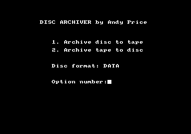 Andy Price of Dunstable in Beds has submitted a very useful disk archiver. It will archive tape to disk and disk to tape, and achieves a pretty respectable speed by reading and writing one track at a time, saving it on tape as a headerless file of &1200 bytes length. AA