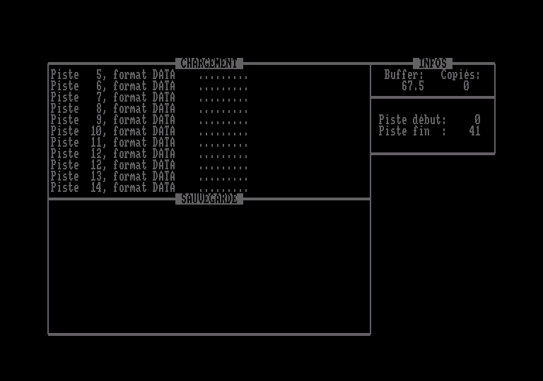 Ce programme permet de gérer des disquettes aux formats DATA et SYSTEM, ainsi que DATA+ et SYSTEM+ (42 pistes de 10 secteurs).