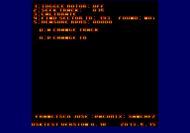 After having faced for the first time the µPD765a I think I have now a nice little tool for using with your 3" or 3.5" drives. The tool lets you turn the motor on and off, seek a specific track, try to find a specific SectorID, calibrate and measure (I think quite reliably) the rotational speed of the motor. I didn't know it wasn't so hard programming for the FDC controller. Total time for the tool has been around 8 hours. Almost more time setting up the text in the correct places in the screen and testing than any other thing :) Regarding the reliability of the measured RPMs in Winape it always gives me 300 RPMs. I tried with some drives here and it works like a charm. Of course there could be a little deviation but I think this is really useful at least diagnosing non-working drives as it happened to me with the latest two ones I bought. One of them is already repaired. The final solution I used for measuring the RPMs was to look for an invalid SectorID or a track without address marks. Both performs fine. I also want to warns to anybody that would like to use it. If it breaks your drive I am not responsible. So you have been warned. For me it has been really helpful. Any suggestion in order improving it would be more than welcome!