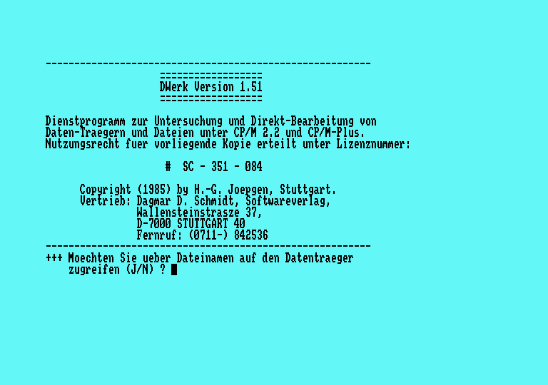DWERK ist ein sehr leistungsfähiger Disketten-Editor. Nicht einmal die Anleitung kann eigentlich alle Fälle umfassen, die hiermit behandelt werden können. Das für eigene Bedürfnisse kopierbare Programm wird dem Viel-CP/M-User bald unentbehrlich sein. Da es mit ca. DM 98 - ausgesprochen preiswert ist, sollte es in keiner Sammlung fehlen!